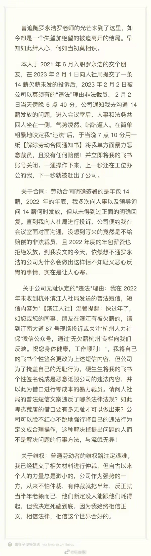 有网友爆料,在向人社局投诉14薪欠薪未发后,被交个朋友暴力裁员,且没有任何赔偿。