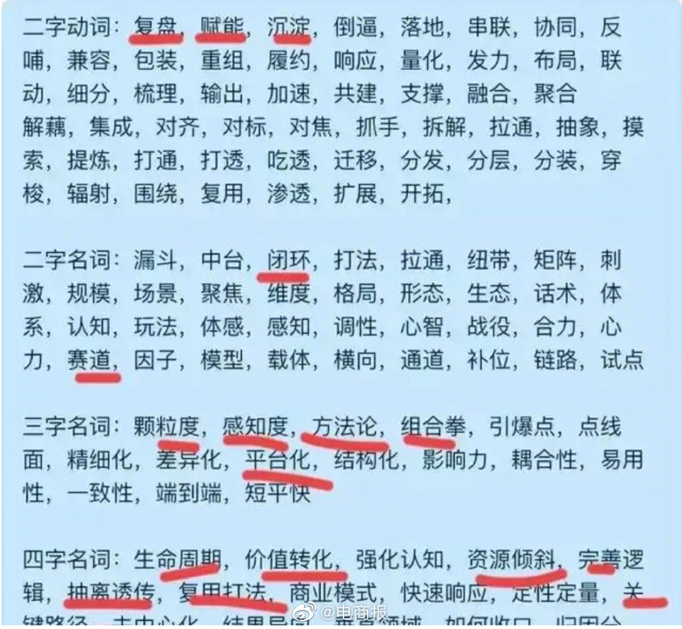 错的不是这些词,错的是只会抄这些词的人,和只会听这些汇报的领导。每个词是一种工作方法的精炼浓缩,如果公司上下对这些方法形成共识,用一个简单缩写代替,那沟通效率多高啊。主管听汇报不能停留在词语上,应该检查细节是否落实否则就是喊口号。