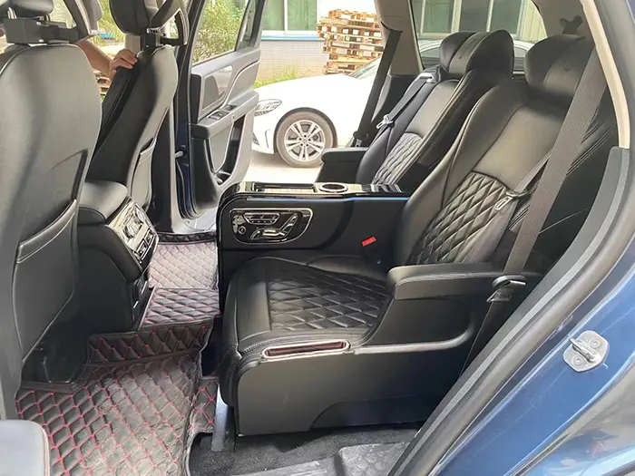 中排升级航空座椅后空间大了许多,而且调节功能非常多,都采用电动进行调节,功能带电动前后移动、电动腿托、电动靠背调节,这些功能都是原先没有的,尤其是靠背调节、在路途上可以提供打躺休息,原车的座椅靠背角度实在是太直了,坐久了腰会不舒服,另外带的电动腿托也可以很好的提供腿部放松。