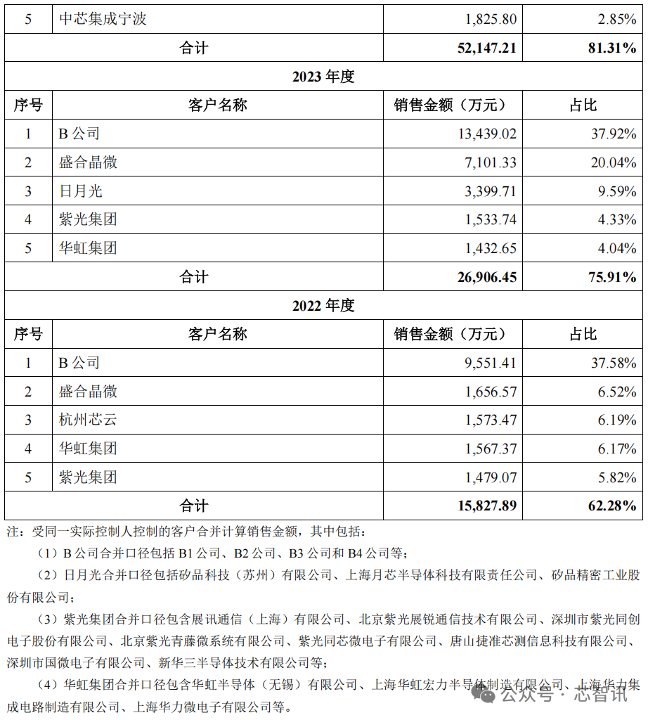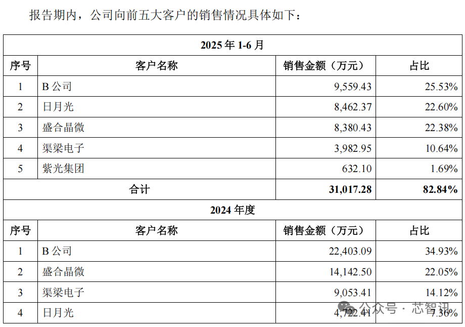 在招股书中,B公司还被认定为关联企业。报告期内,强一股份直接向关联B公司销售产品实现的收入分别为0.96亿元、1.34亿元、2.24亿元和0.96亿元,占营业收入的比例分别为37.58%、37.92%、34.93%及25.53%。如果算上其他向强一股份采购,实际为B公司提供芯片测试服务的企业贡献的营收占比则分别为 50.29%、67.47%、81.84%和 82.83%。这也意味着,日月光、盛合晶微等都是B公司的客户。