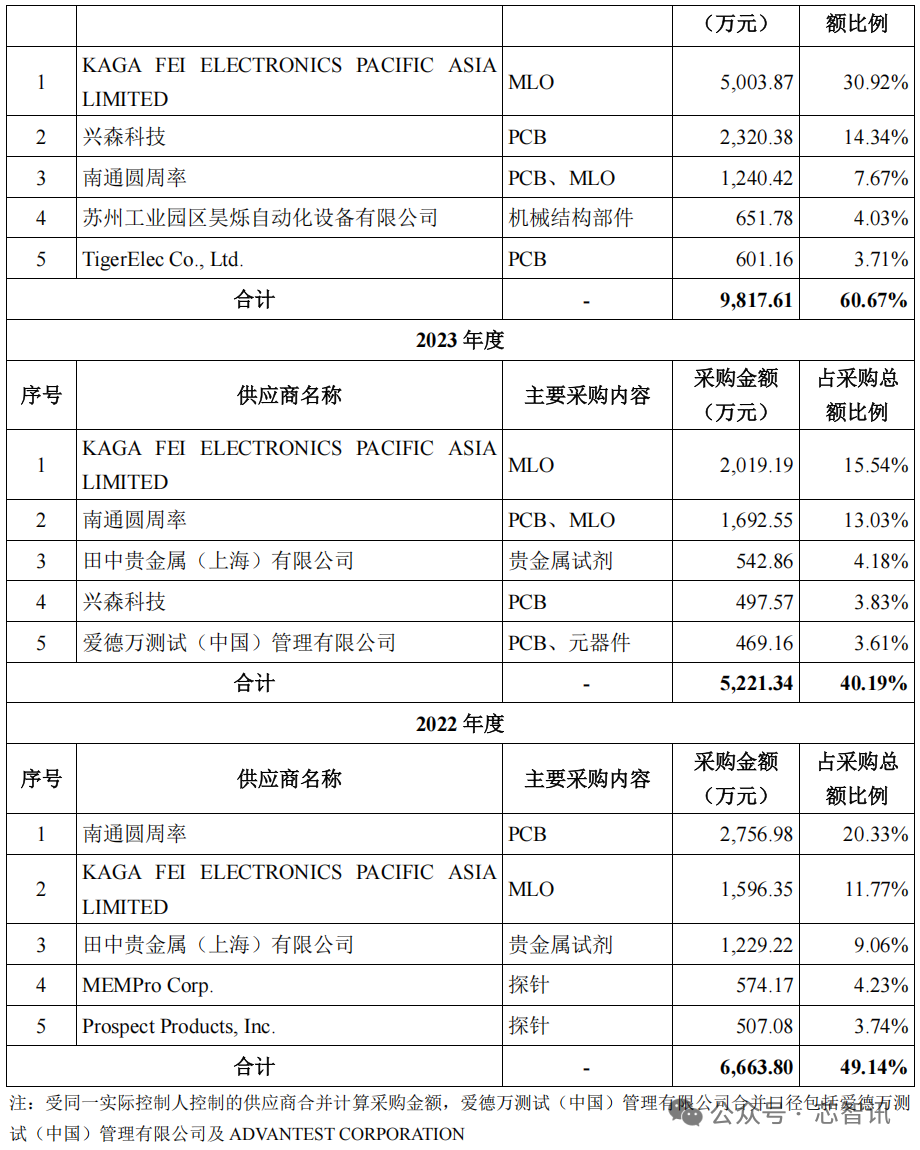 招股书显示,报告期内,强一股份向前五大供应商采购金额分别为 6,663.80 万元、5,221.34 万元、9,817.61 万元和 8,634.72 万元,占采购总额的比例分别为 49.14%、40.19%、60.67%和64.27%,集中度较高,主要系采购探针卡所需的 PCB、MLO、贵金属试剂、探针及机械结构部件等;同时,公司设备供应商集中度亦相对较高。由于部分原材料、设备的稀缺性,公司存在向单一或少数供应商采购金额占同类原材料、设备采购金额比重较高的情形。