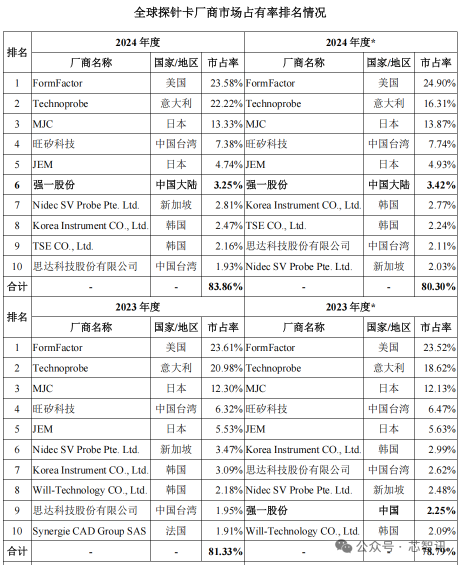 根据公开信息搜集并经整理以及 Yole 的数据显示,近年来,前十大探针卡厂商合计市场份额均超过 80%。其中,前五大厂商排名均未发生变化,合计市场份额约为 70%,为第一梯队厂商。前五大厂商中,FormFactor、Technoprobe 以及 MJC 稳居前三,历年均保持了 10%以上的市场份额,具有相对竞争优势;JEM、旺矽科技市场份额在 4%-8%之间小幅波动。第六至十名厂商的排名存在一定变化,属于第二梯队,其中 2023 年、2024年强一股份分别位居全球半导体探针卡行业第9位、第6位,是近年来唯一跻身全球半导体探针卡行业前十大厂商的境内企业。