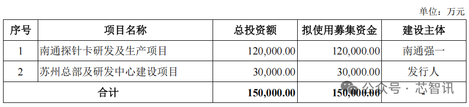 强一股份本次募集资金主要用于南通探针卡研发及生产项目、苏州总部及研发中心建设项目,总投资额为 150,000.00 万元。