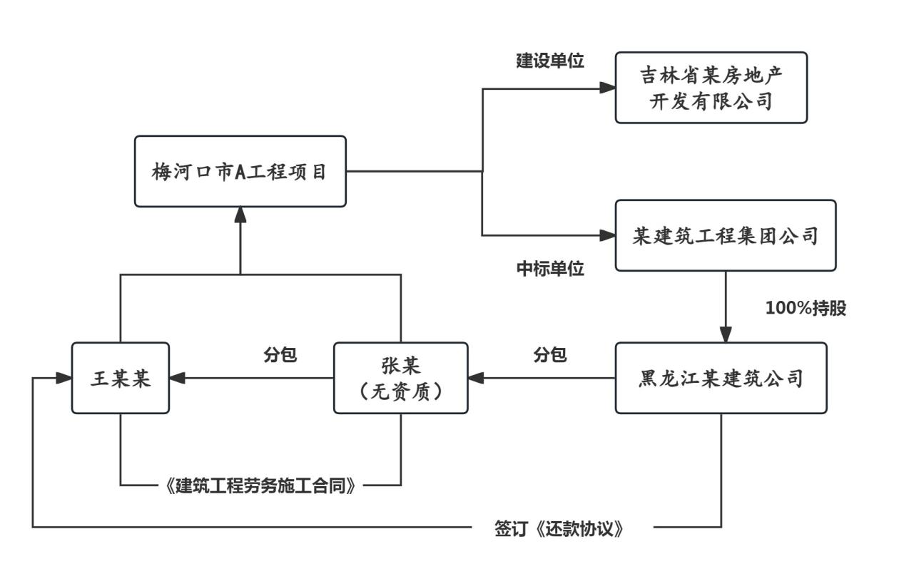 该案系王某某与张某、黑龙江某建筑公司建设工程合同纠纷,执行标的为75340元。纠纷主要集中在某建筑工程集团公司为梅河口市A工程项目的中标单位,工商信息显示该集团公司系黑龙江某建筑公司持股比例100%的公司股东,因此二公司具有关联关系,后黑龙江某建筑公司将承包的A工程项目分包给了无资质承包的张某,后张某又将部分工程再次分包给了无资质的王某某。但张某却未结清应付给王某某的全部人工费,后王某某与黑龙江某建筑公司就剩余欠款共计694752.71元签订了《还款协议》,约定于2022年春节前结清。但黑龙江某建筑公司并未按照承诺时间支付剩余欠款。