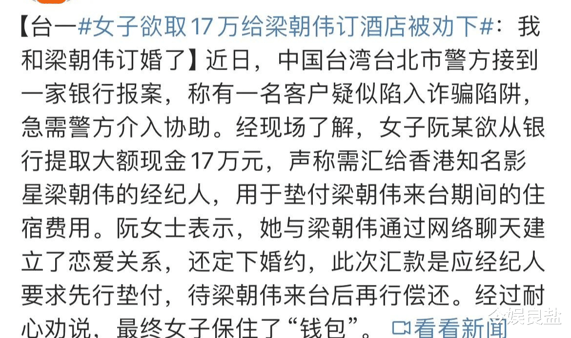 哎,最近看到一个新闻,笑死我了,又气又好笑那种!一个姑娘,说自己跟梁朝伟订婚了,要给梁朝伟付17万的酒店住宿费! 17万啊!够我在北京买个厕所了吧? 这姑娘,不是去订酒店,是直接去给骗子送钱啊!她去银行取钱的时候,银行工作人员都惊呆了,估计心里在想:这年头,骗子都这么明目张胆了吗?