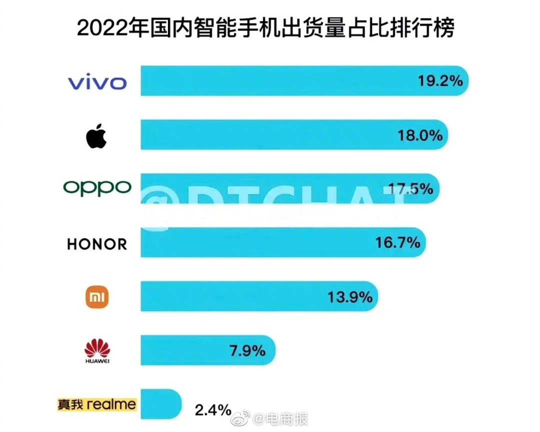 手机行业新格局:VO荣米,“华米OV”退出舞台。荣耀CEO赵明曾说要在高端市场改变苹果一家独大,去年出货量增速明显,荣耀离目标更近一步了吗?(图源:DTCHAT)