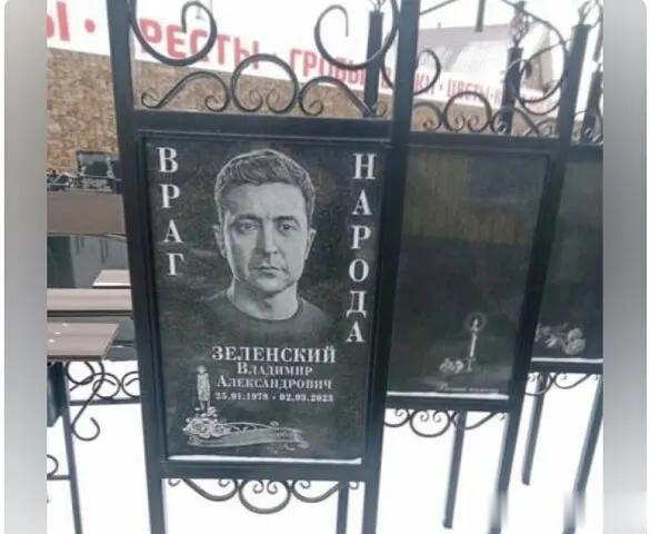 在拉门斯克市公墓附近惊现一块刻有泽连斯基形象的纪念碑匾,展示的纪念碑属于墓地附近一家出售丧葬用品的商店。乌克兰领导人的“死亡日期”定为2023年3月2日。还没有到日子,不知道预言准不准。