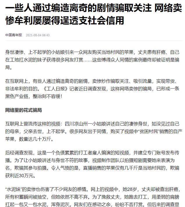 中国青年报-2021年8月4日-《一些人通过编造离奇的剧情骗取关注 网络卖惨牟利屡屡得逞透支社会信用》