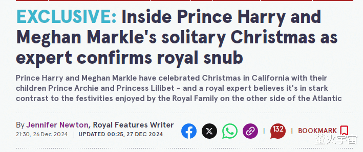 “自2018年与梅根结婚以来,哈里王子只在同年12月在桑德灵厄姆与王室家族过了一次圣诞节。他在加利福尼亚州唯一的亲戚是他的岳母多里亚,据梅根说,她将在蒙特西托的家中与他们在一起度过圣诞节。”