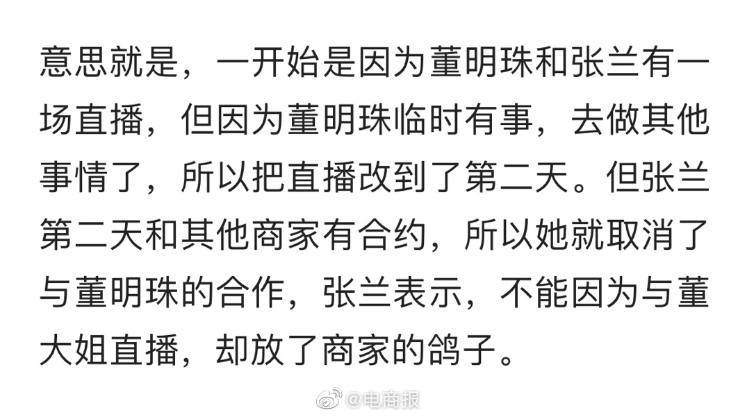 合作临时取消,董明珠不愿与张兰带货?张兰回应:董明珠有更重要任务改了行程,但自己第二天有合作,不能因为蹭所谓的董大姐流量就失信。