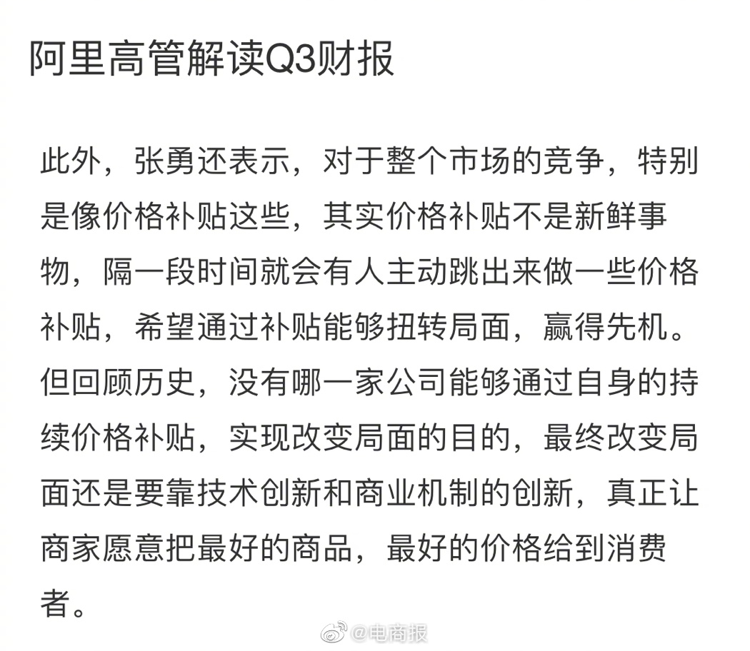 张勇:没有哪家公司能通过持续价格补贴改变局面,阿里二十几年一直坚持通过技术突破去获得市场领先地位。据悉,京东百亿补贴已在内测中。