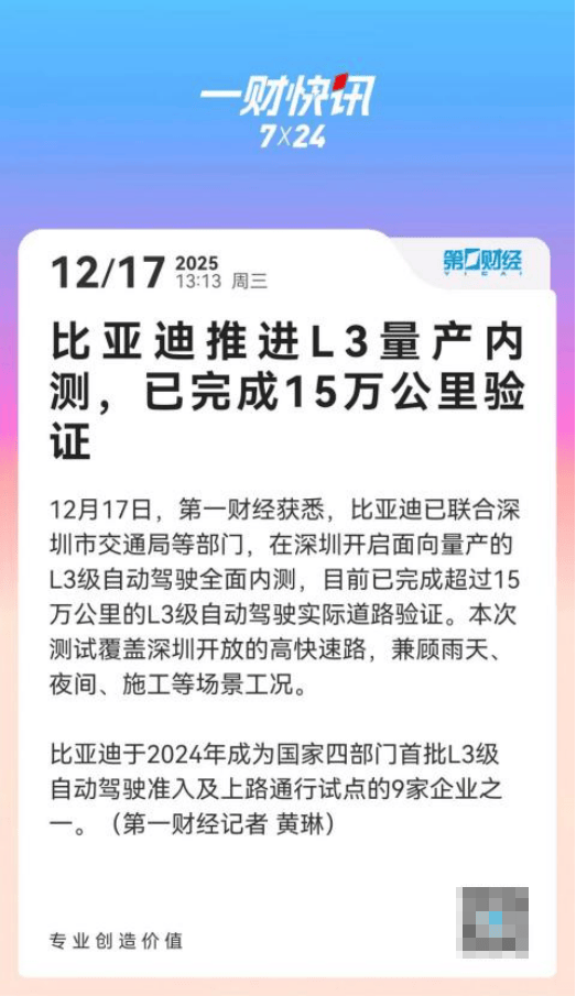2月17日,有媒体获悉,已联合深圳市交通局等部门,在深圳开启面向量产的L3级自动驾驶全面内测,目前已完成超过15万公里的L3级自动驾驶实际道路验证。本次测试以安全为核心,覆盖深圳开放的高快速路,兼顾雨天、夜间、施工等不同场景工况。全面验证L3级别产成熟度和可靠性,为国家L3级自动驾驶落地提供实践依据。