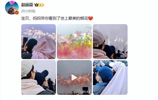 看完烟花秀回去之后,赵丽颖就发了个微博,晒出烟花秀和自己抱着儿子的照片,表示自己带儿子看到了最美的烟花。