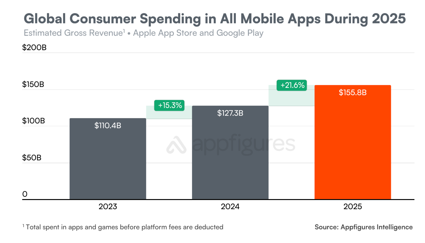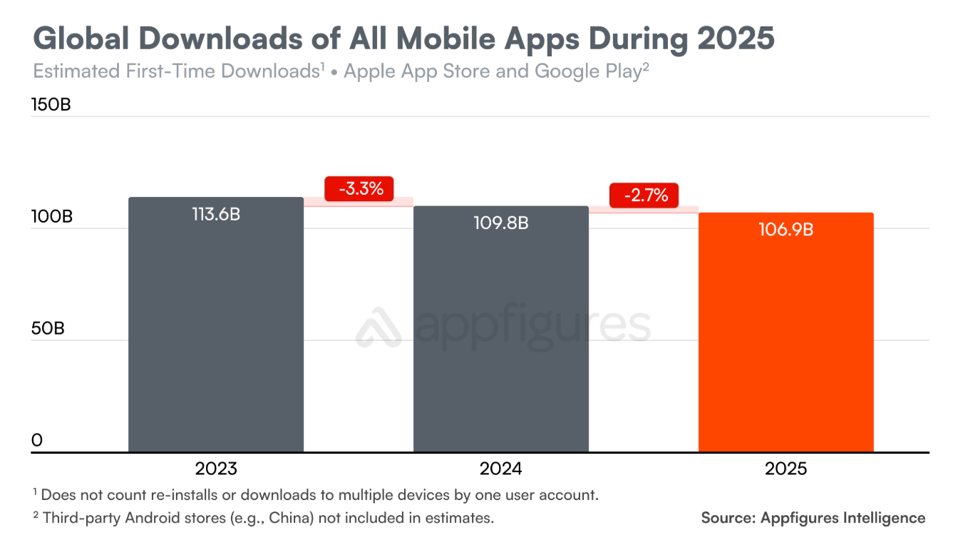 Appfigures的报告显示,2025年,苹果App Store和谷歌Google Play上的移动应用和移动游戏全球下载量预计达到1069亿次,同比下降2.7%。与此同时,消费者支出增长21.6%,预计达到1558亿美元。