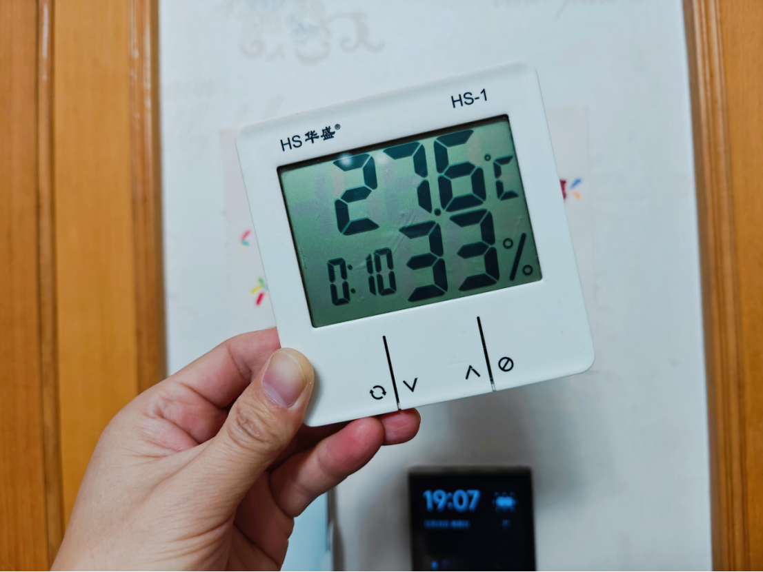 开始测试之前,我们看到温度计上的温度显示为21.7℃。当我打开取暖器高热模式5-6分钟后,卧室温度达到了26.5℃,升温将近55℃,这效果可以说是相当出色。