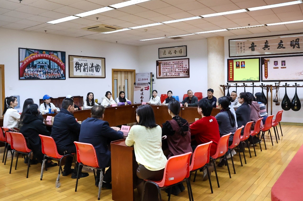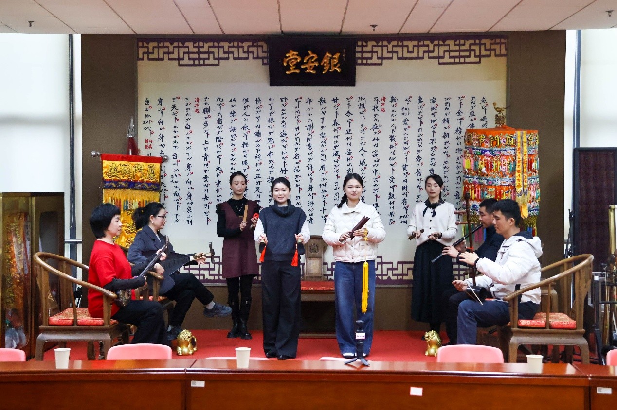 活动在原创南音作品《咱厝南音》的悠扬旋律中启幕。这首由陈美瑜老师精心谱写的曲目,巧妙融合了闽南传统建筑意象与古典音律,在保留传统曲牌骨架的基础上,注入现代创作思维,描绘出孩童在红砖古厝前传唱南音的生动场景,引人沉浸于闽南独有的古韵氛围之中。表演结束后,陈美瑜老师向实践队成员细致梳理了南音的起源、演变与当代传承脉络,并强调“在传承中创新,在创新中扎根”的理念,为整场活动奠定了“守正不守旧”的交流基调。