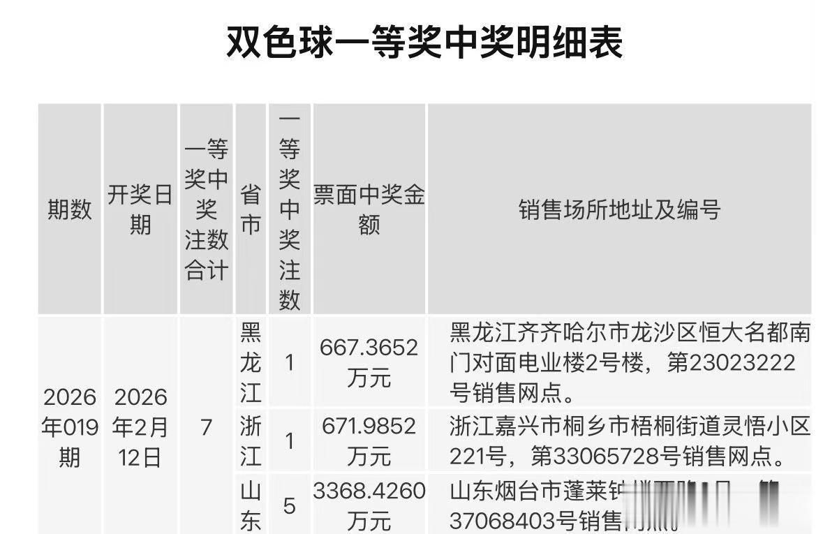 上期一等奖开出7注,单注奖金高达667万余元,其中山东一人独中5注,收获3368万万余元,黑龙江齐齐哈尔和浙江嘉兴各1注,目前奖池仍蓄有27.16亿元的丰厚储备。愿幸运眷顾每一位心怀梦想的彩友,盼鸿运常伴、惊喜连连,好运接踵而至,皆能如愿以偿!