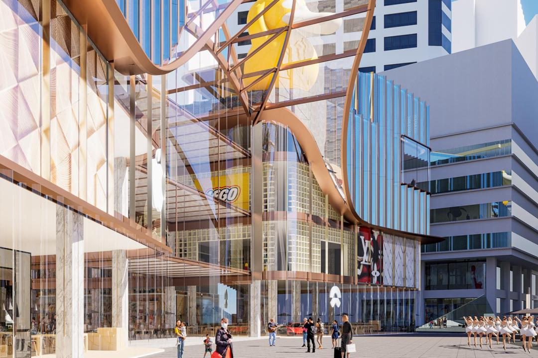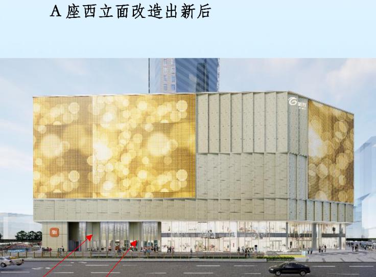 以商场西北侧部分外立面为例,升级后,将以大面积金属幕墙和玻璃为主,并以流线型的玻璃穹顶,让立面更具层次感、通透感、曲线美。