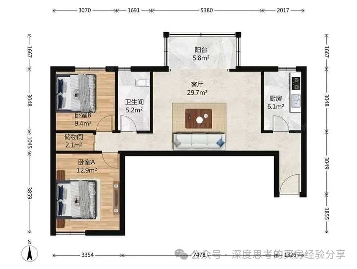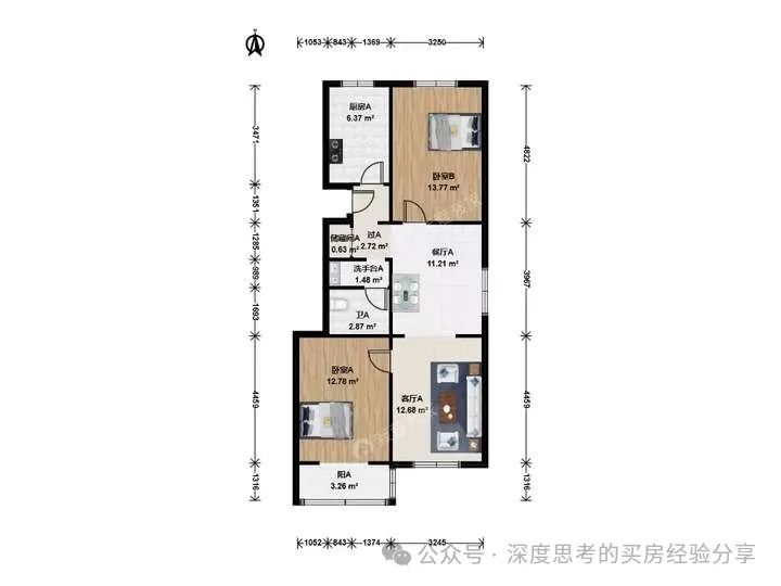下面这个户型是93.39平米的两居室,南北朝向,中楼层/共6层,目前报价1150w。