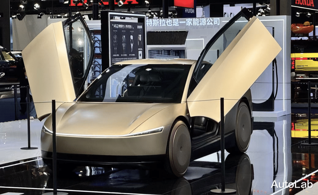 聚光灯下,一辆金色小车缓缓驶上舞台。它没有后视镜,没有方向盘,没有踏板,只有两个座位和一块中控屏,车门像科幻电影里的飞船一样向上翻起。