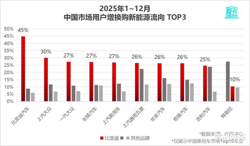 这意味着,比亚迪已经从单一品牌竞争者,成长为全行业用户“置换新能源”的核心去向品牌,在增换购这个存量博弈的主战场上,形成了极具压制力的“虹吸效应”。