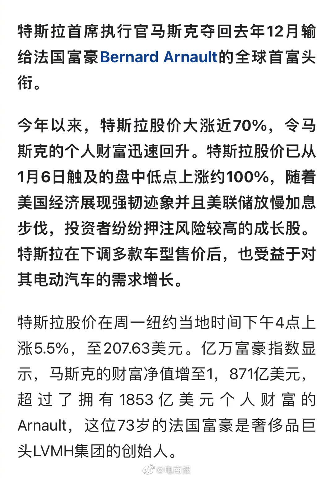 特斯拉股价不到两个月反弹100%,身价达1871亿美元,马斯克重夺世界首富之位。马斯克:我又回来了!