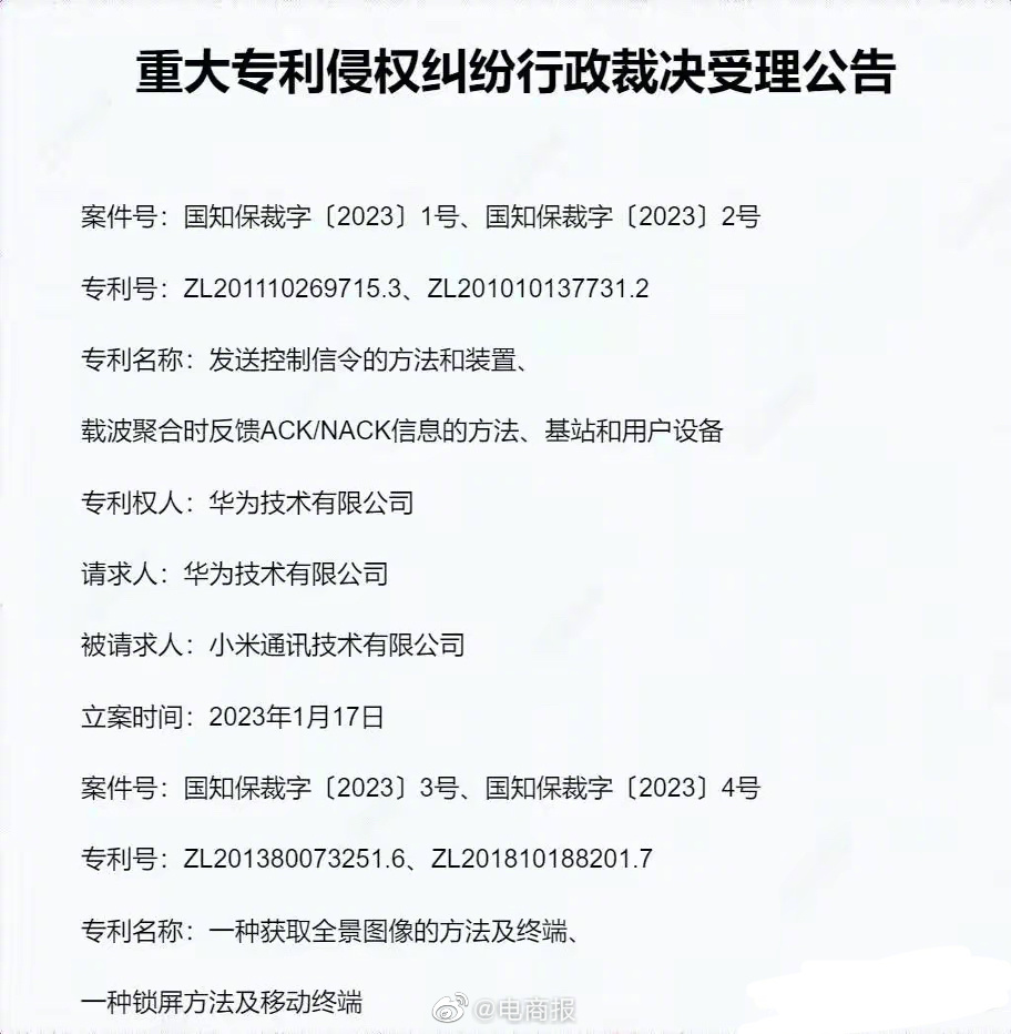 华为告小米专利侵权,涉及4G/LTE技术及手机照相和解锁技术四项专利,国家知识产权局已受理。