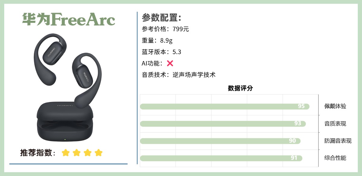 华为Free ARC耳机延续了其标志性的C形桥体结构,基于超过两万份耳廓样本数据,优化出140°三角力学支撑系统,机身覆盖超柔软液态硅胶,单耳重量仅为8.9克,在实际运动测试中连续佩戴4小时依然无压迫感。