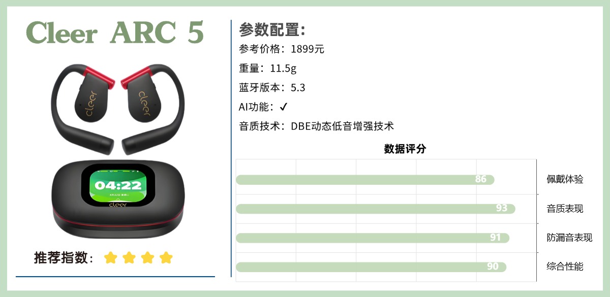 Cleer ARC5的亮点在于其全面的AI智能化能力与均衡的综合配置。耳机采用开放式耳挂结构,耳挂部分选用亲肤医疗级软硅胶,结合可双向调节的伸缩旋转轴心,能灵活匹配多种耳廓形状,显著提升佩戴时的稳固与贴合感。单耳仅重约11.5克,短时佩戴轻盈无压。