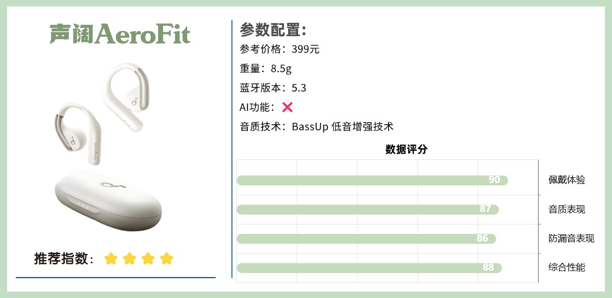其搭载的蓝牙5.4技术,不仅连接稳定可靠,还具备低延迟特性,无论是观影还是游戏,都能实现流畅的音画同步。配合6小时单次续航与24小时总续航、IPX5级防水以及多项AI智能功能的支持,使其成为目前百元价位开放式耳机中极具竞争力的选择。
