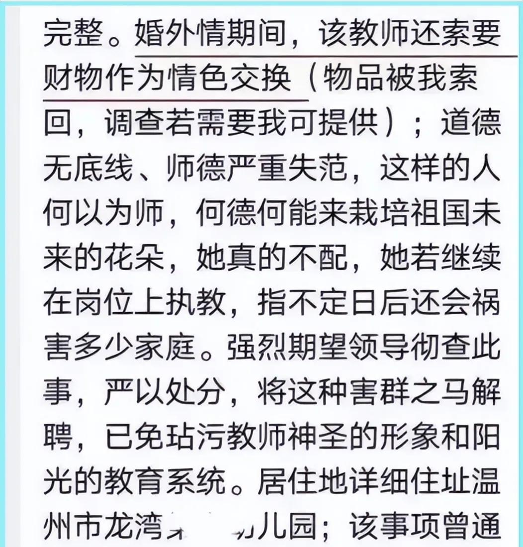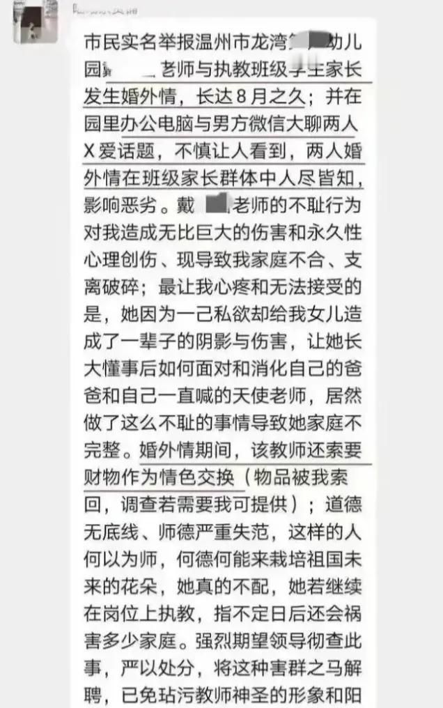 三观尽毁!温州女幼师被曝出轨学生家长,8个月花百万。近日,在浙江温州,发生了一件让人毁三观的事情,某幼儿园老师戴某利用职务之便出轨学生家长,八个月的时间,对方就给这名老师转账高达百万, 戴老师经常以孩子问题为借口,找孩子爸爸沟通,沟通来沟通去,就沟通到一起了,据悉,男方是当地一个厂子的老板,不差钱,名下有好几家公司,仅仅偷情数月,就为其花费近百万,戴某明知对方有家庭,仍抵不过钱的诱惑,一有空就与对方厮混。孩子母亲发现后,将其举报到了教育局,指责她破坏别人家庭,道德败坏,玷污教师职业。 我现在在想幼师这个问题,现在考幼师的门槛已经如此之低了吗?难道相关法规不应该适当的调整方针,将矛头指向幼师资质的方面?一位生活不检点且道德规范缺失,行为如此恶劣的女性职业竟然是一位老师! 虽然有些朋友认为我的感叹有些多余,“一位幼儿园老师而已啊,不需要太多的能力就能管好孩子。”但是如果这样一位老师是您家孩子的负责人,您会感到欣喜吗? “师者,传道授业解惑者也。”上幼儿园的孩子们正是生性好动,对这世间的一切充满着好奇的年纪,您能够保证品质不是那么优秀的老师能够耐心地解答您孩子繁复的问题吗?即使解答了那它的质量会很好吗?您能保证她的回答不会让孩子对这世界产生不一样的理解吗? 我认为,当下某些地方的教师好丑不一,良莠不齐。希望可以完善相关制度,为祖国的下一代创建更好的成长环境,也让家长朋友们省省心。 老师这个岗位,是用来教书育人的,首先自身要正,毕竟是言传身教,尤其是幼师,教的是三观,是道德,是为人做事,是培育内心的浩然正气 老师私德有亏,上梁不正,学子堪忧。