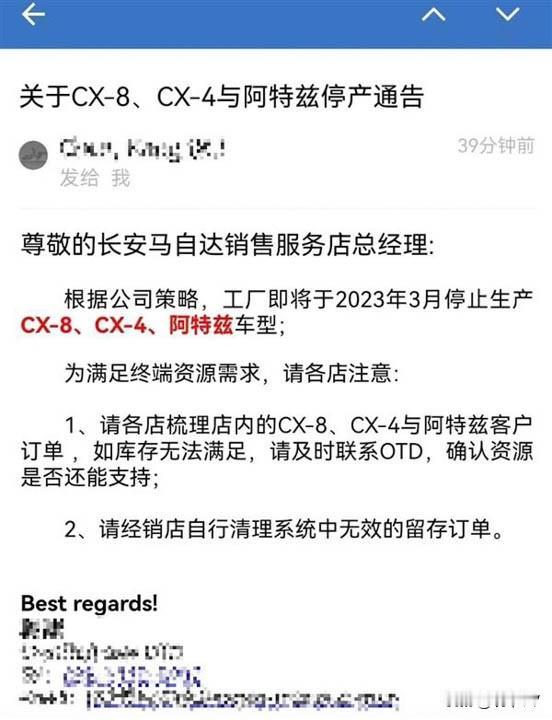 【网传马自达多款车型停产!没想到阿特兹最后还是成了绝版】此前,马自达因曝出内部员工价12.15万元即可购得指导价为18.98万元的阿特兹,而受业内外关注,这一情况源于马自达传出“关于CX-8、CX-4与阿特兹停产通告”。对此,有中新经纬拨打了长安马自达的客服热线,对方表示,此消息属实。这也意味着旗下CX-8、CX-4与阿特兹退出国内市场,未来将只有马自达3、马自达CX-30、马自达CX-5以及即将到来的马自达CX-50和CX-90等车型。