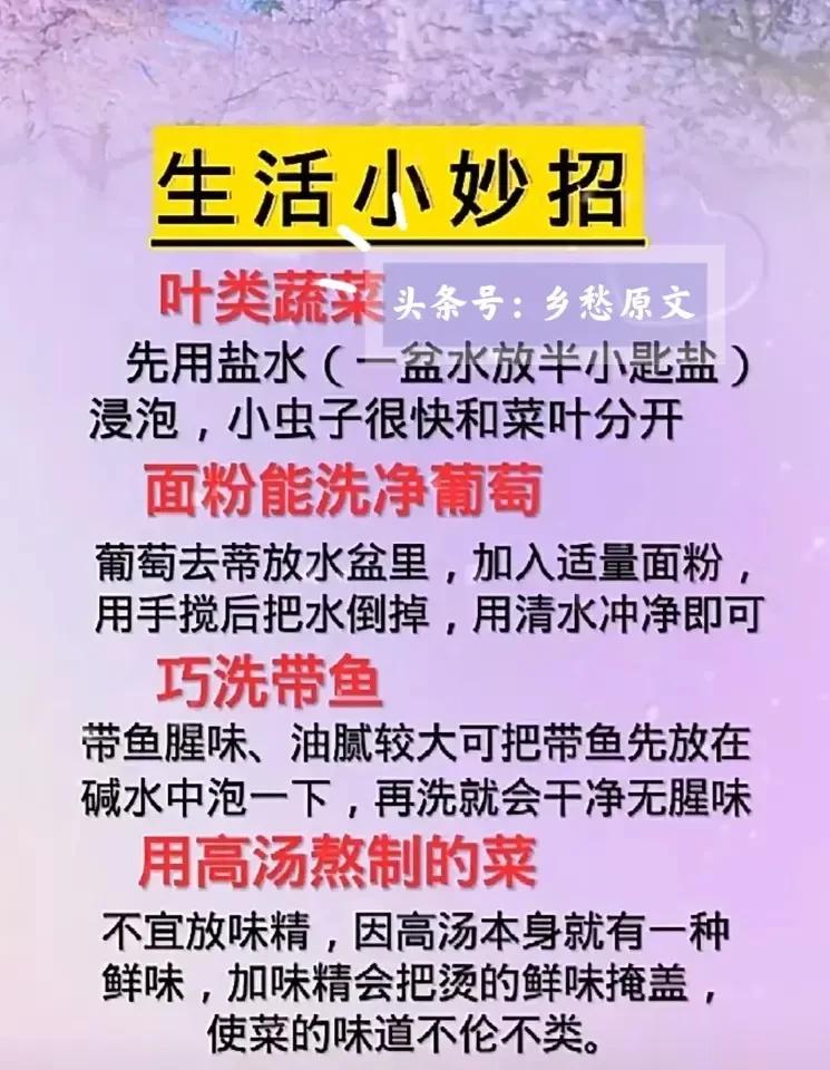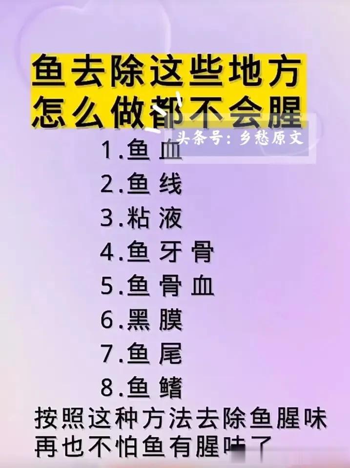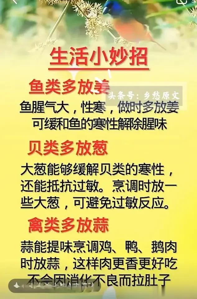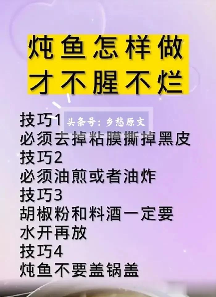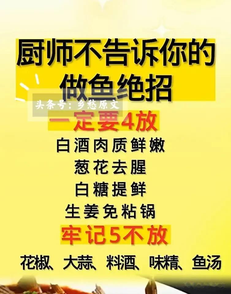 生活小常识,生活小技巧,厨师都不会告诉你做鱼的诀窍!比如,鱼怎样做才好吃?一定要记住4放:放白酒肉质鲜嫩,葱花去腥,白糖提鲜,生姜免粘锅。花椒,大蒜,料酒,味精,鱼汤5不放!这样做出来的鱼美味又好吃!保存起来,下次做鱼的时候记住!