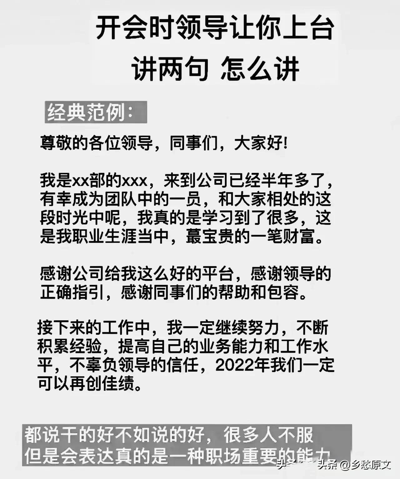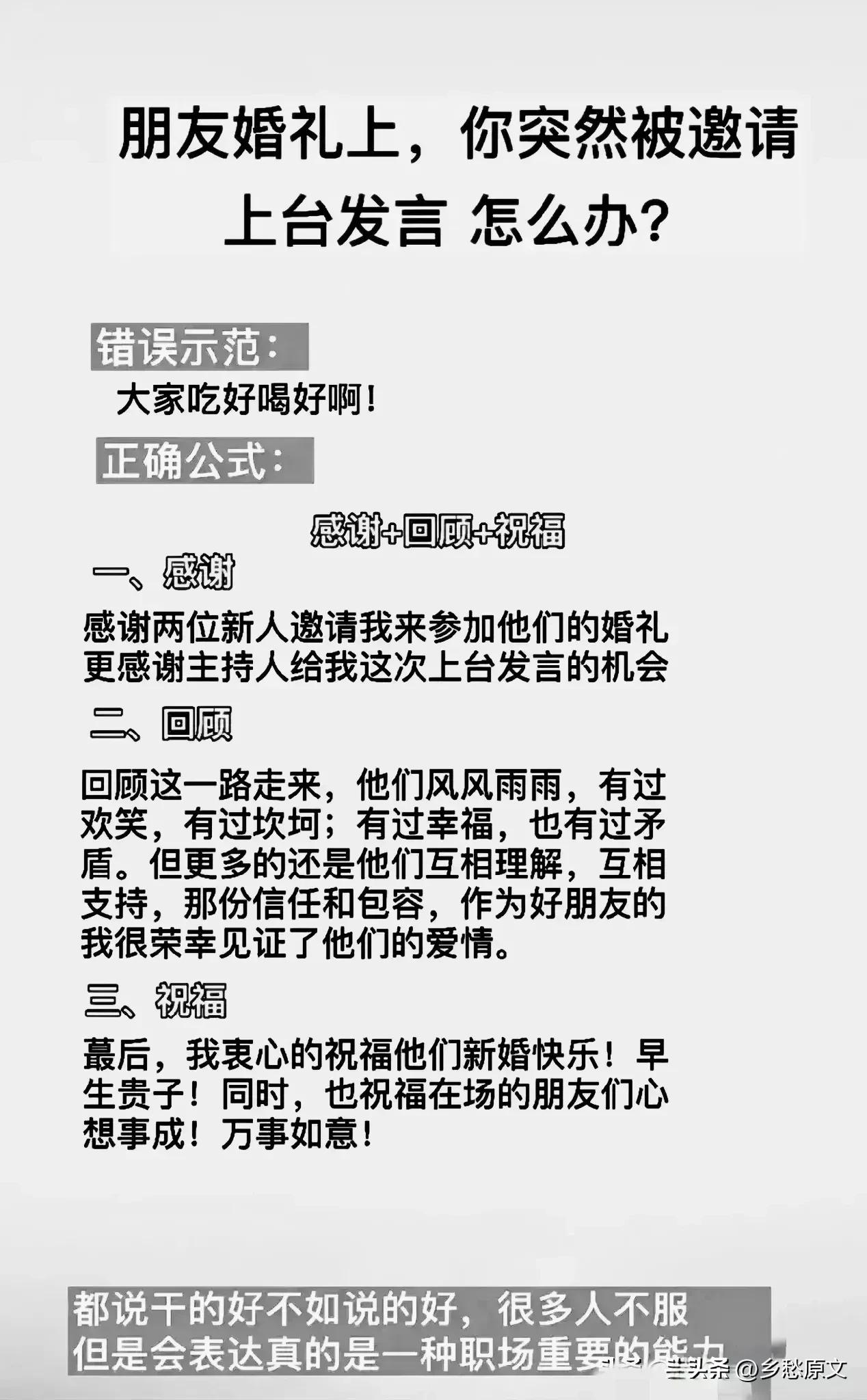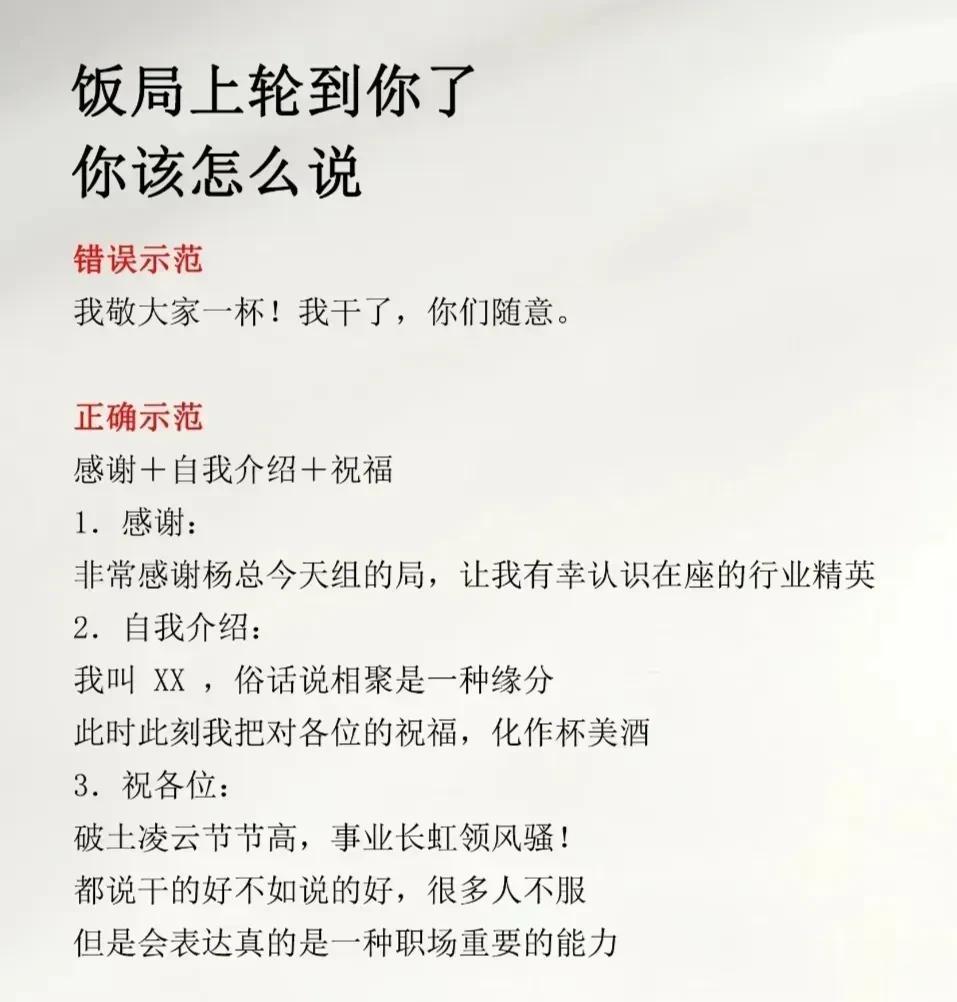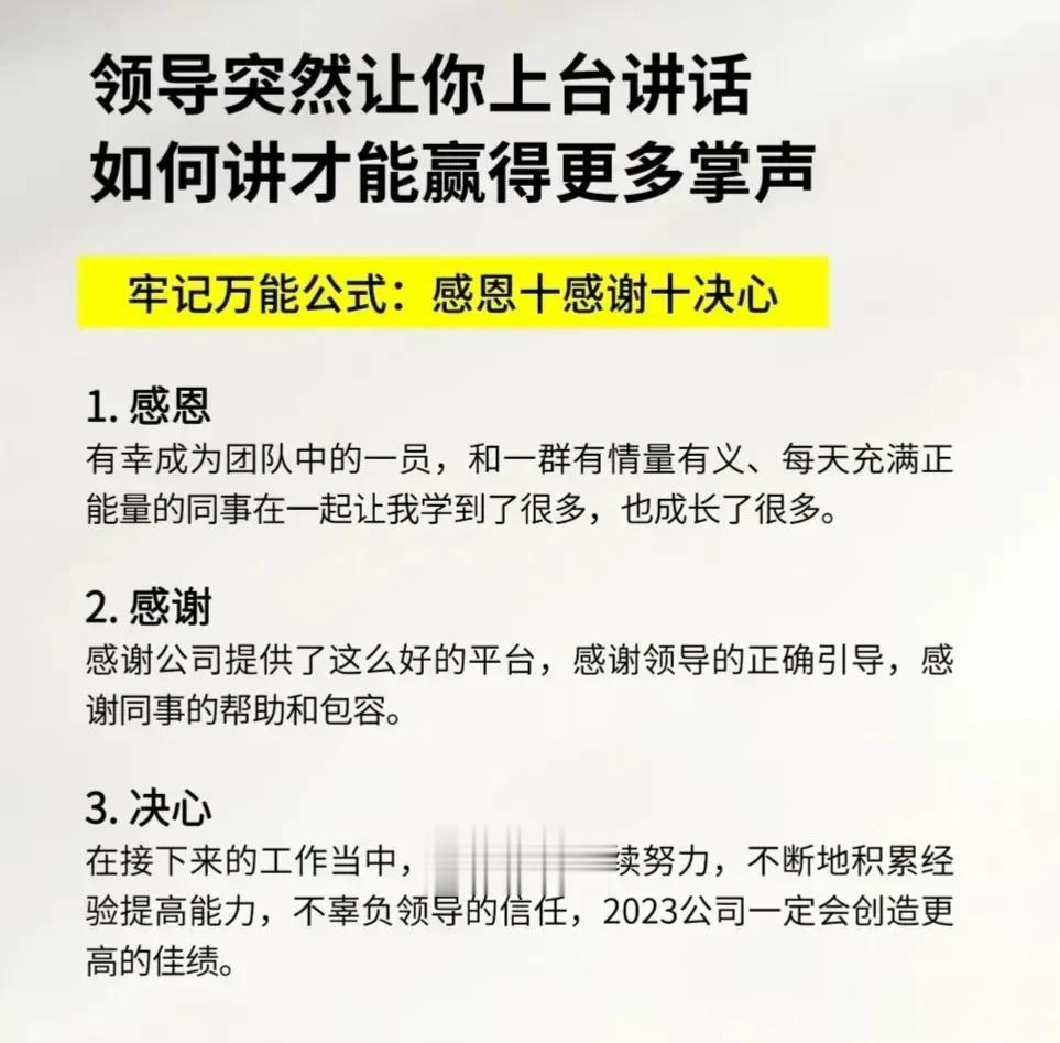 天呐!做东请客吃饭,开场白怎么说?感激+回馈+祝福。领导突然让你上来讲话,如何才能赢得更多掌声?牢记万能公式+感恩+决心!人们都说干的好,不如说的好,会表达真的是一种职场重要的能力!不信你试试!