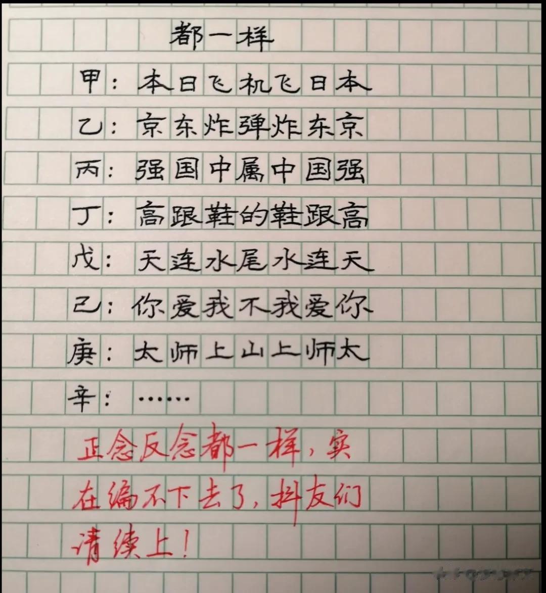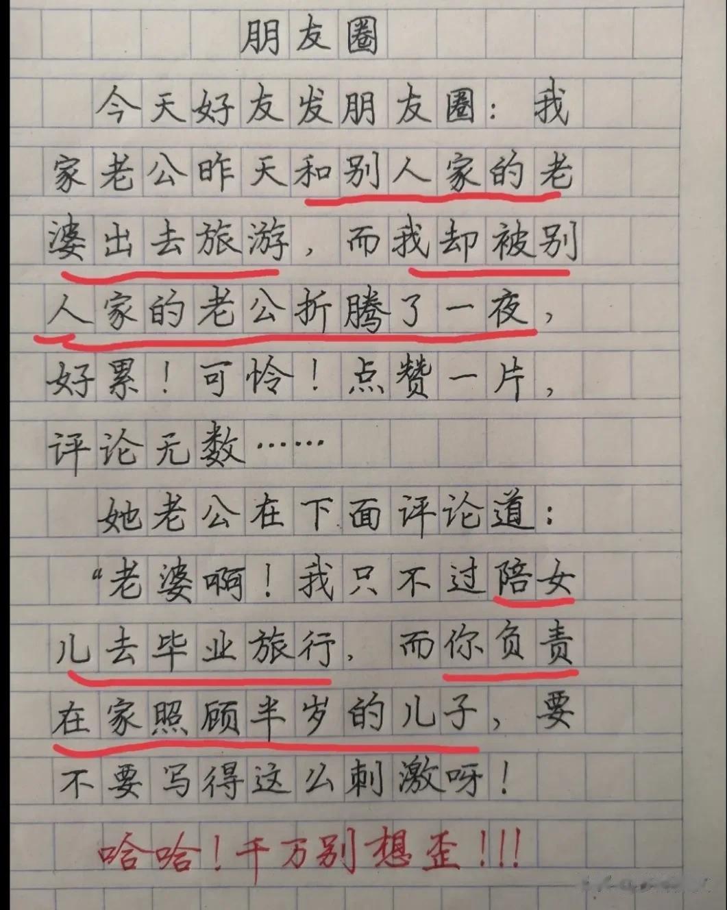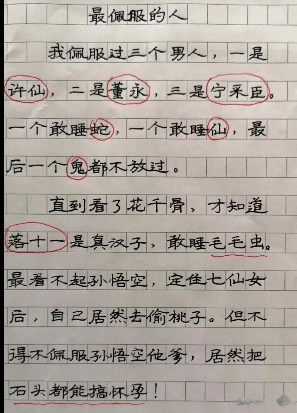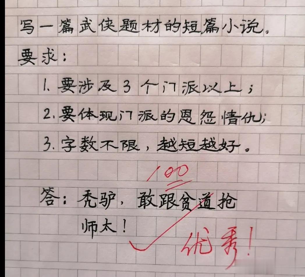 天呐!人才的写作!段子一:以记叙文的形式,叙述某人的一生《他的一生》你写的太牛了!聪明绝顶的人才,段子二,写一篇武侠题材的短篇小说,要求:三个门派以上,体现门派恩怨情仇,字数越短越好!答:秃驴,敢跟贫道抢师太!真是一个比一个有才!一篇比一篇精彩!