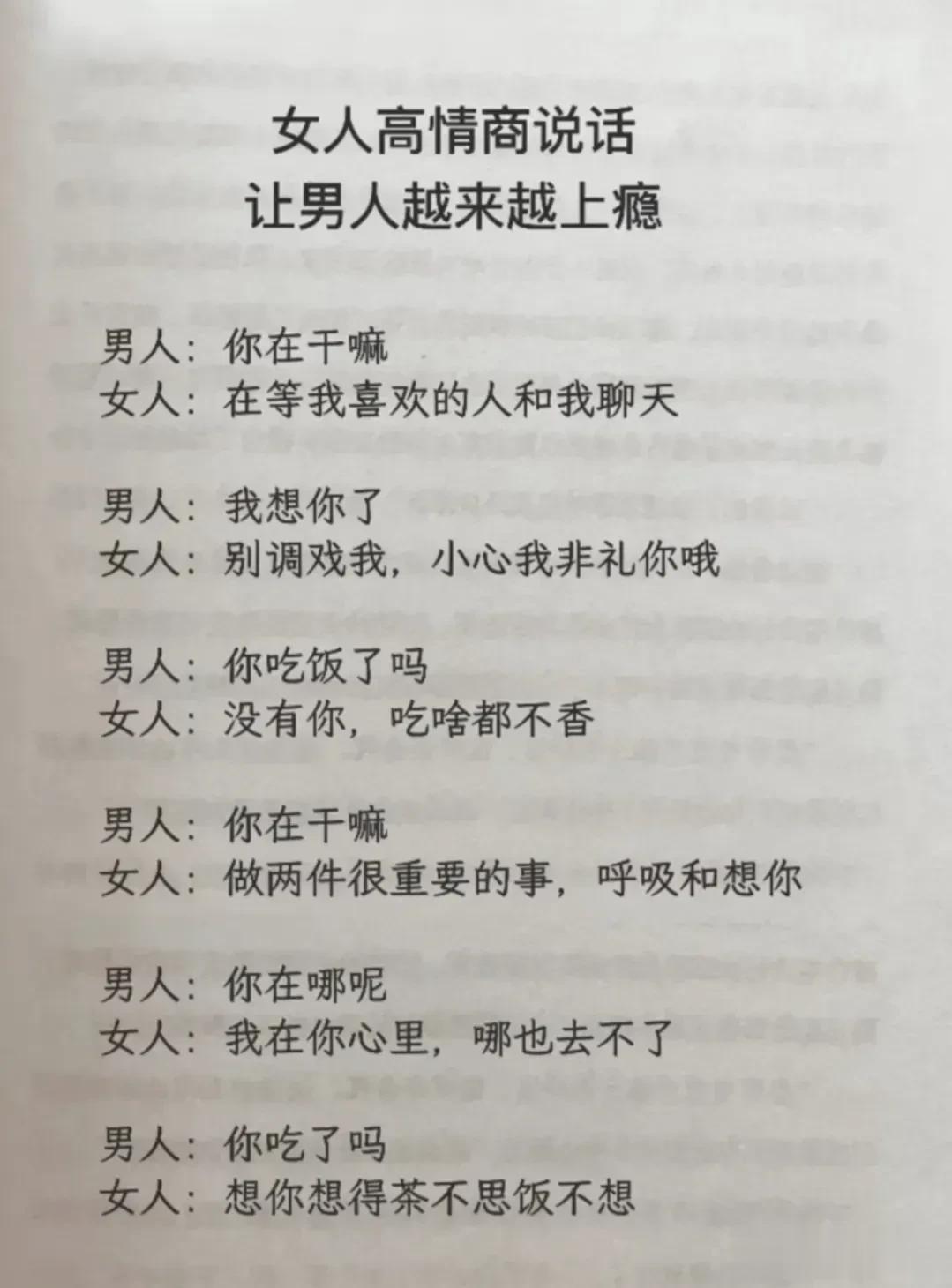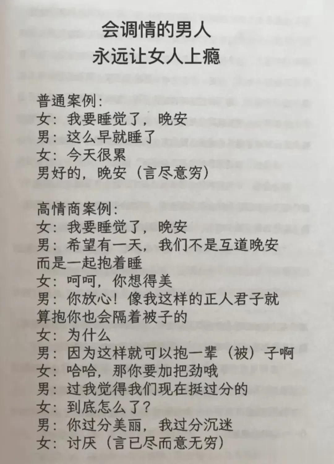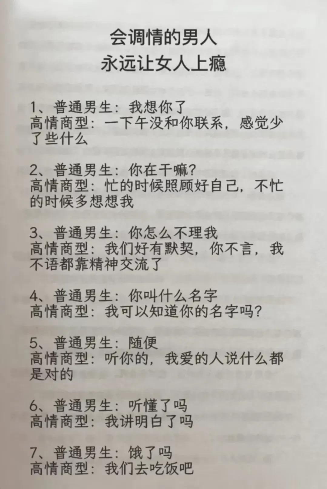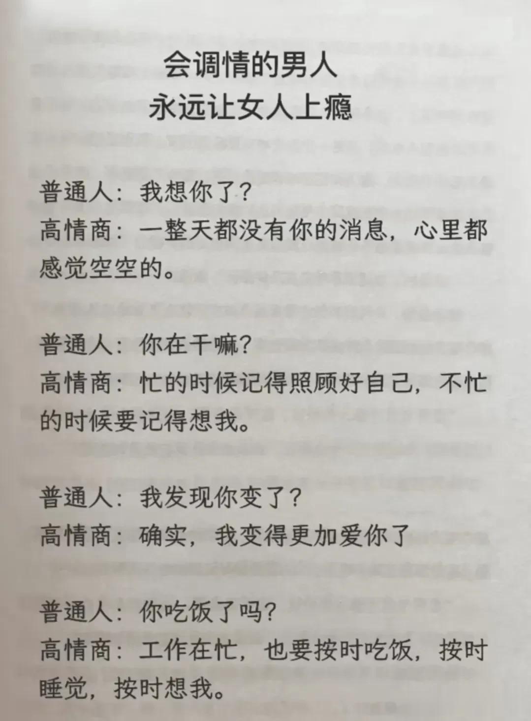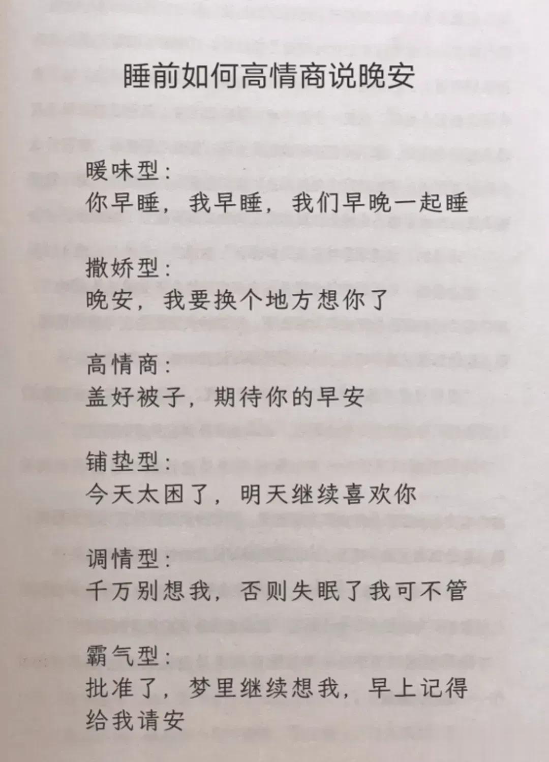 高情商,幽默型聊天!比早安!好100倍 高情商: 1、突然好想你你却还没起。 2、早安终于不用梦里想你了。 3、新的一天同样是更爱你的一天。 4、起床告诉你一个秘密,今天的我比昨天更爱你。 幽默型: 1、早上好,有你的一天开始了。 2、早起的鸟儿有虫吃,早起的人来吃你。 3、早安!小懒猪我来帮你把太阳挂起来。 4、我身体很好,可以扛米袋子, 杠煤气罐,扛不住想你,早安! 说话是一门艺术,聊天是一门技巧! 一开口让人高情商聊天