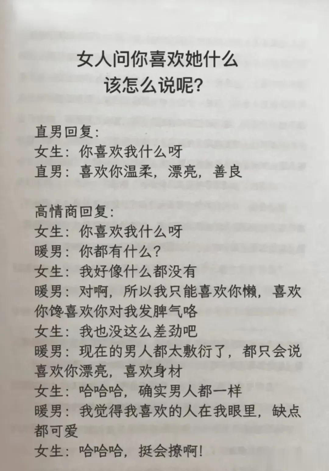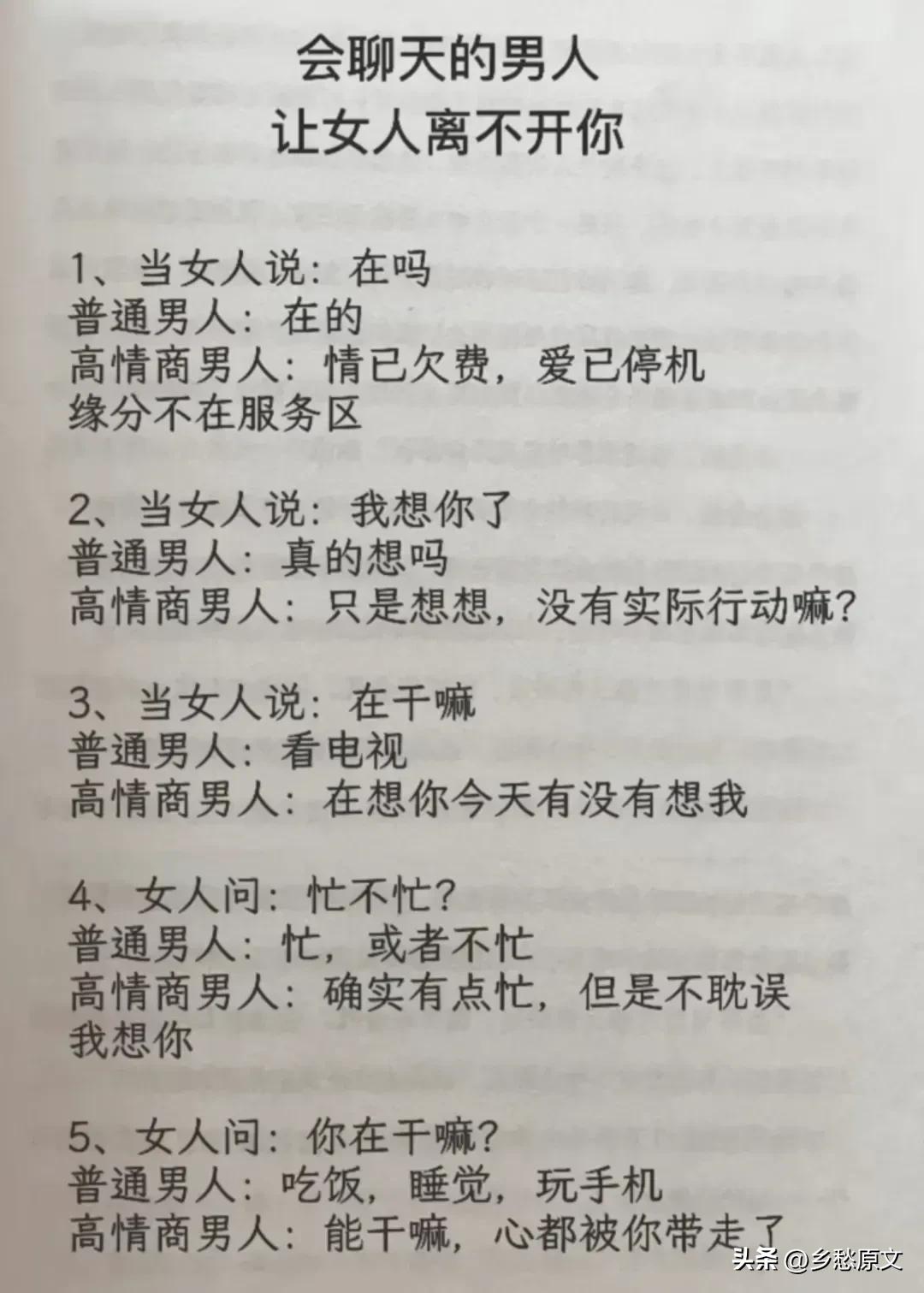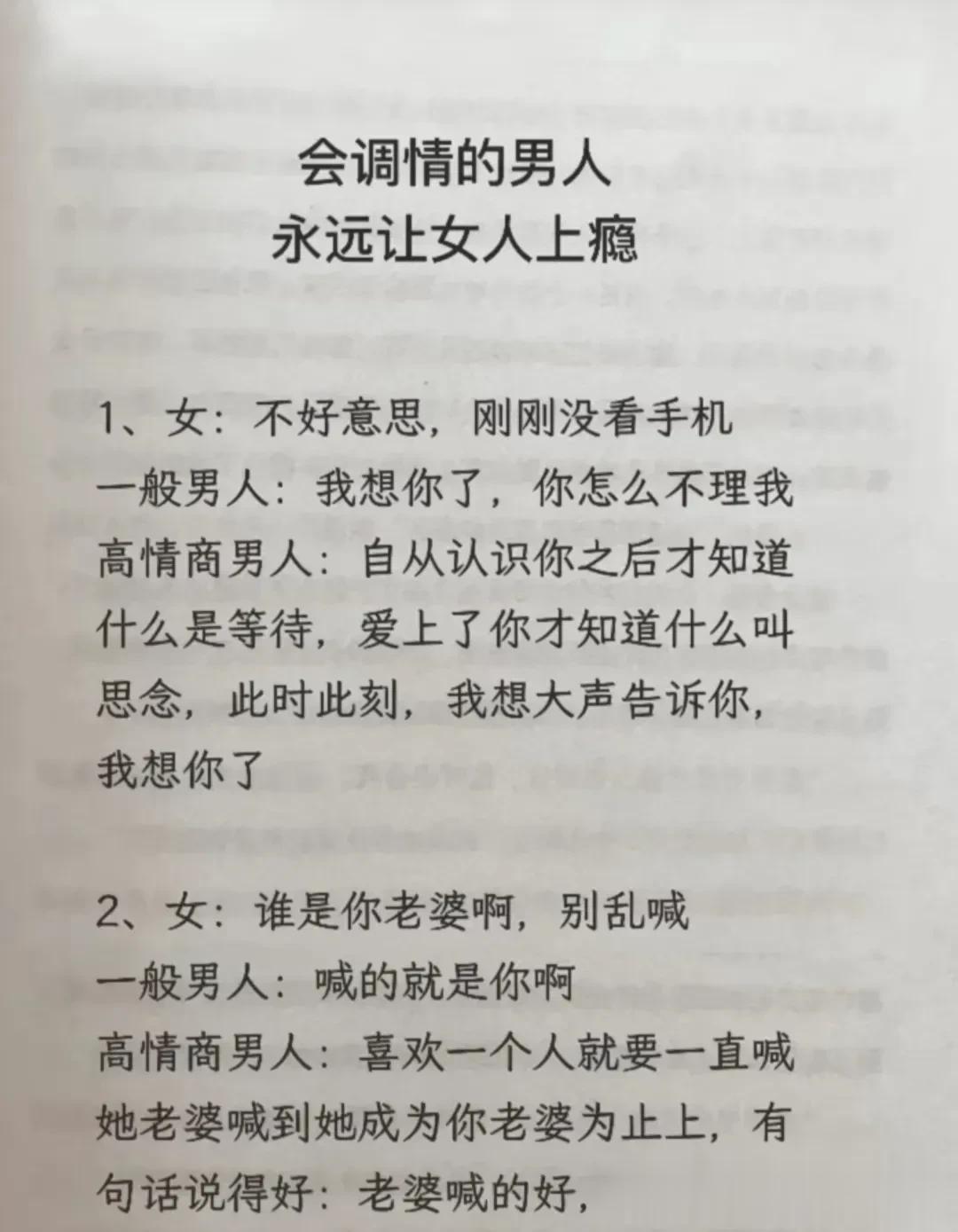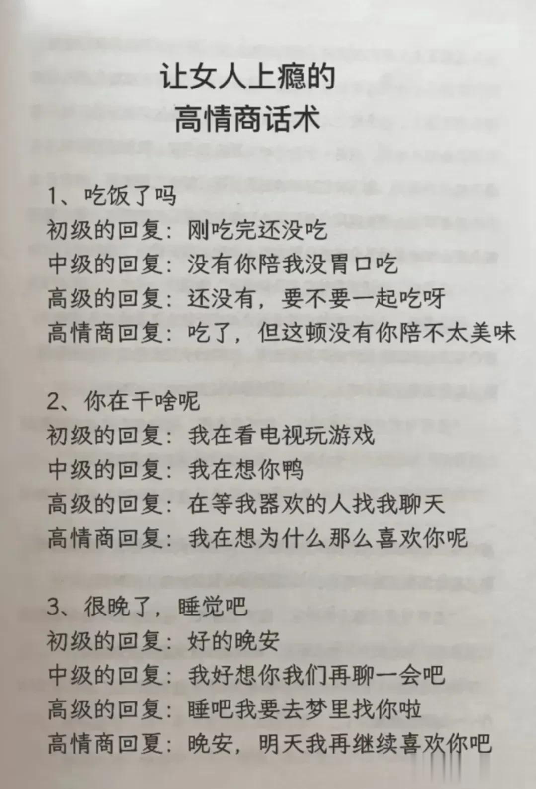 高情商,幽默型聊天!比早安!好100倍 高情商: 1、突然好想你你却还没起。 2、早安终于不用梦里想你了。 3、新的一天同样是更爱你的一天。 4、起床告诉你一个秘密,今天的我比昨天更爱你。 幽默型: 1、早上好,有你的一天开始了。 2、早起的鸟儿有虫吃,早起的人来吃你。 3、早安!小懒猪我来帮你把太阳挂起来。 4、我身体很好,可以扛米袋子, 杠煤气罐,扛不住想你,早安! 说话是一门艺术,聊天是一门技巧! 一开口让人高情商聊天