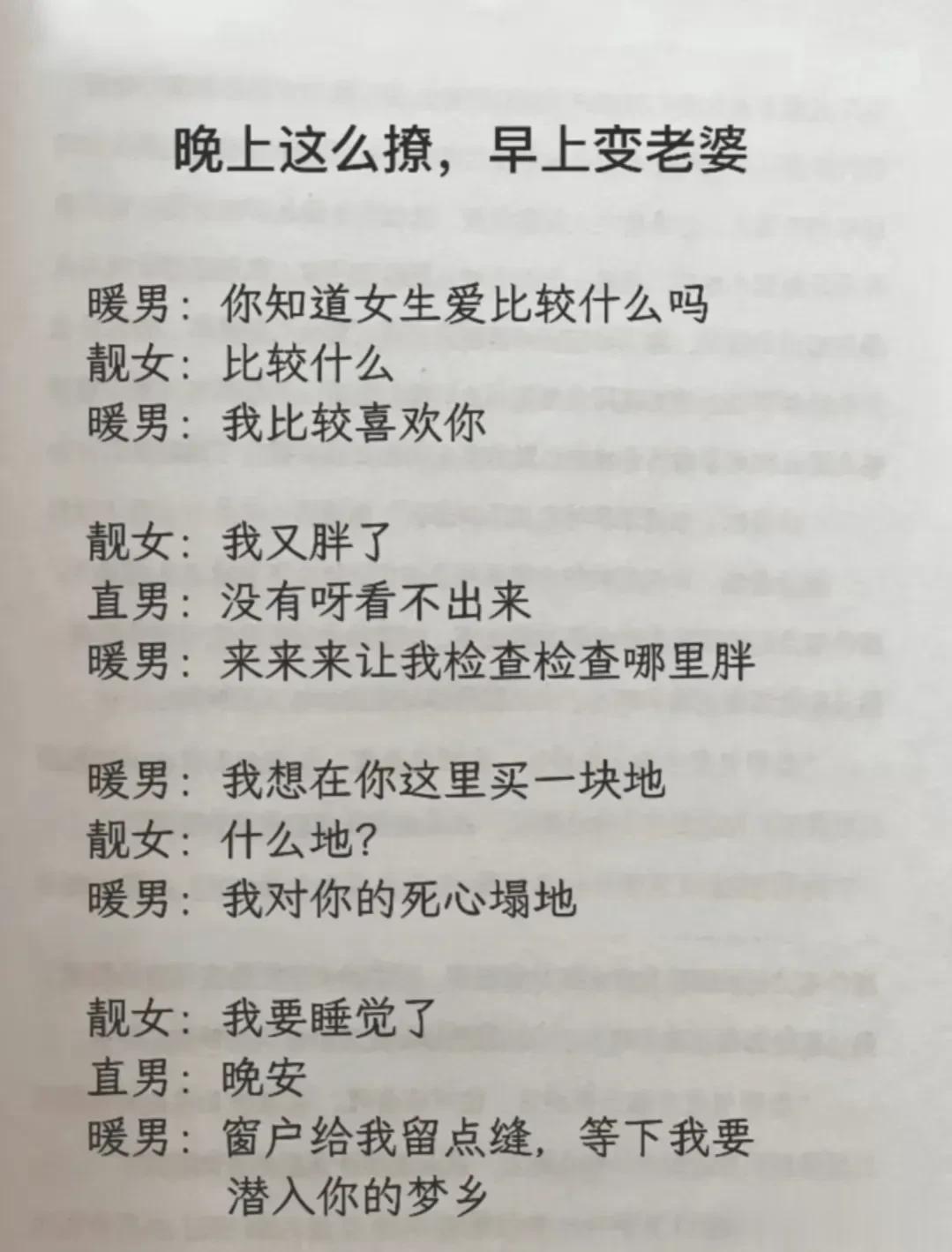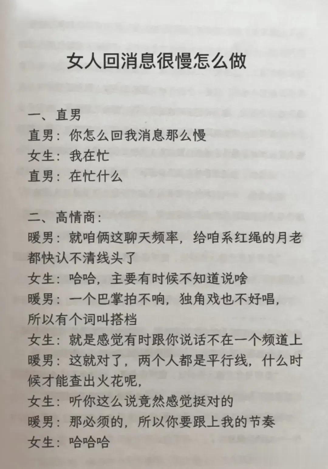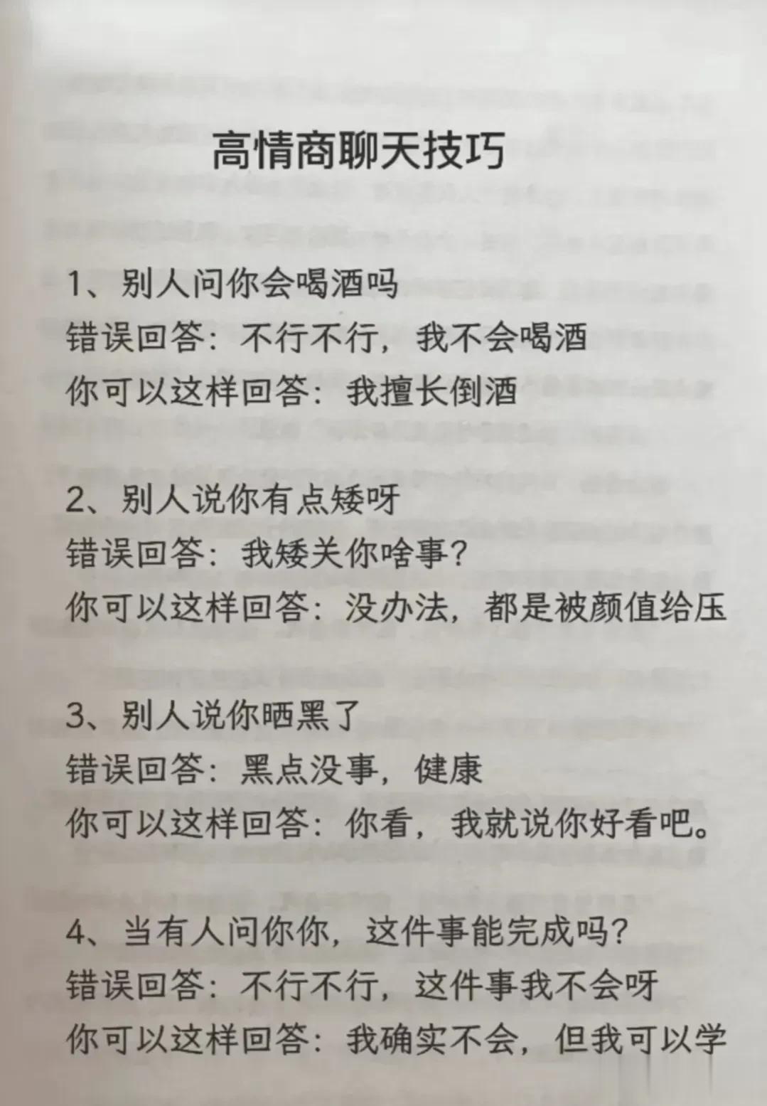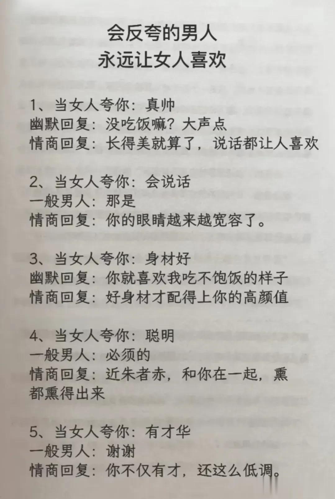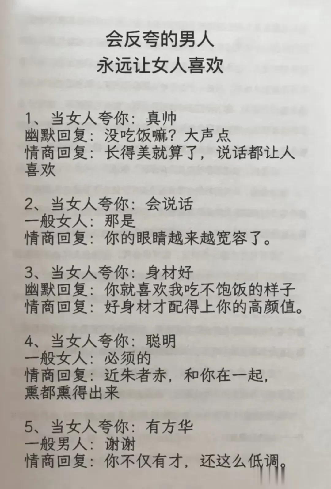 高情商,幽默型聊天!比早安!好100倍 高情商: 1、突然好想你你却还没起。 2、早安终于不用梦里想你了。 3、新的一天同样是更爱你的一天。 4、起床告诉你一个秘密,今天的我比昨天更爱你。 幽默型: 1、早上好,有你的一天开始了。 2、早起的鸟儿有虫吃,早起的人来吃你。 3、早安!小懒猪我来帮你把太阳挂起来。 4、我身体很好,可以扛米袋子, 杠煤气罐,扛不住想你,早安! 说话是一门艺术,聊天是一门技巧! 一开口让人高情商聊天