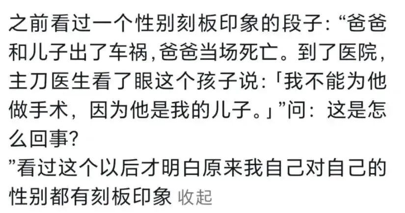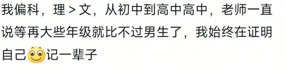 长大后,才后知后觉发现原来我们在长大的过程中,一直围绕着一些普遍的刻板印象,就比如大家耳熟能详的,男生就应该学理科,女生思维能力差就适合文科,大的就应该让着小的,哪有女生不生小孩的,家务做饭都不会,以后嫁人了怎么办等等,我家虽然没有什么重男轻女思想,这些话却也是从小听到大。