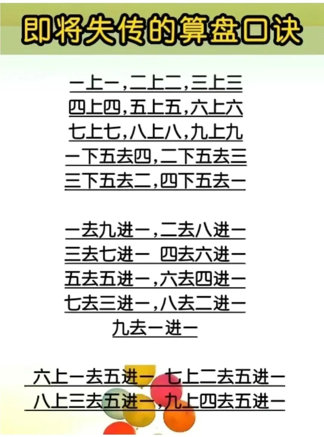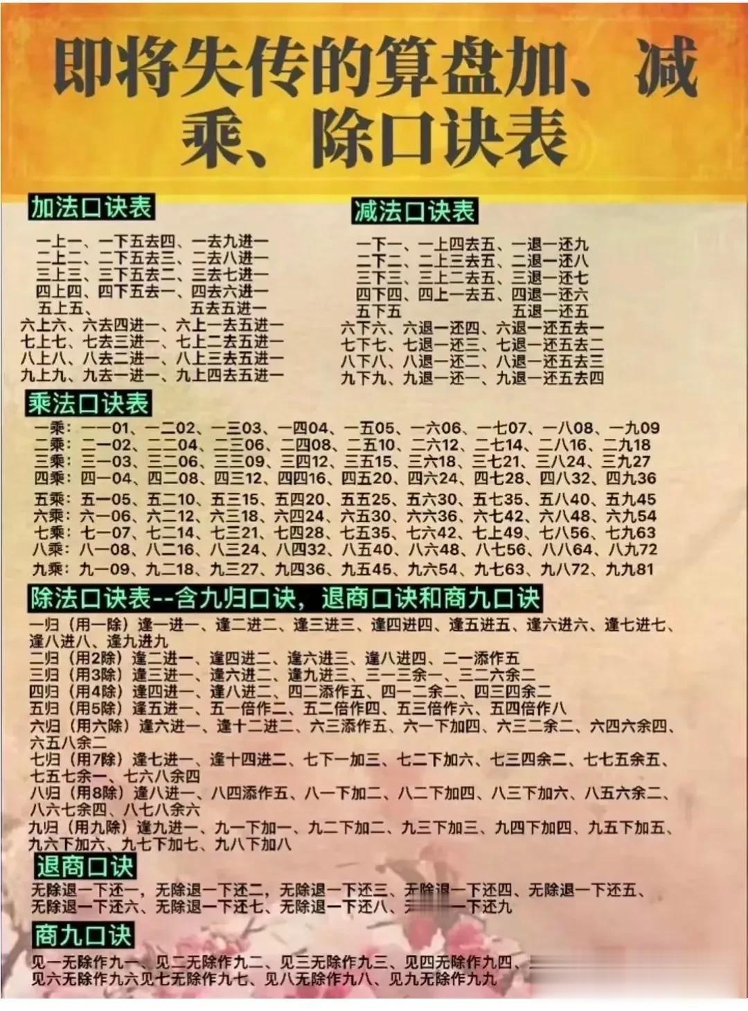 即将失传的算盘口诀九九归一 算盘是中国古老的计算工具,它可以用来进行加、减、乘、除运算。在数字化的时代,算盘已经逐渐被淘汰,但是它所代表的计算方法和口诀却是我们需要继承和传承的珍贵财富。希望能够让更多的人了解和学习。 即将失传的算盘加、减、乘、除口诀表,希望对大家有所帮助,也希望大家能够继承和传承这些珍贵的文化遗产。