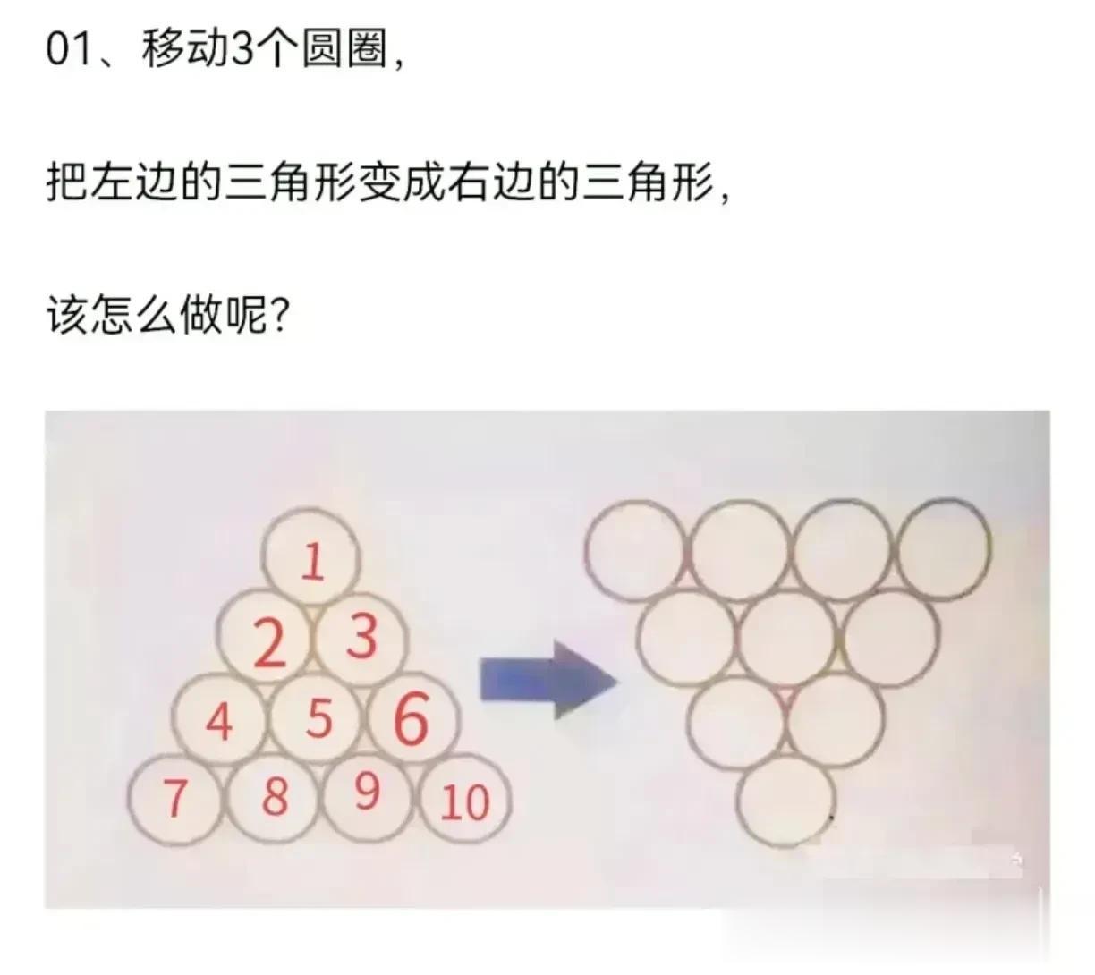 三个⭕️是移动1个的到4个的上面中间,再把4个的一边一个移动到二个的两边就可以了