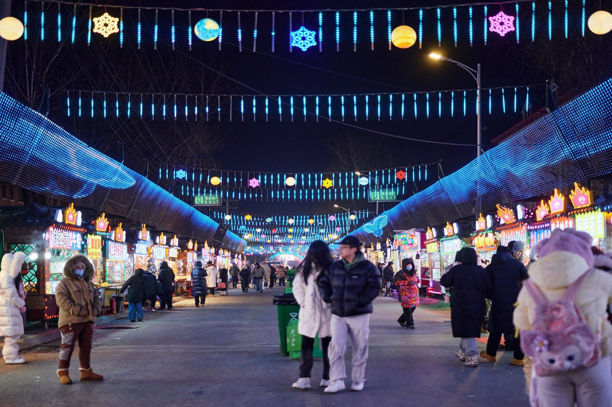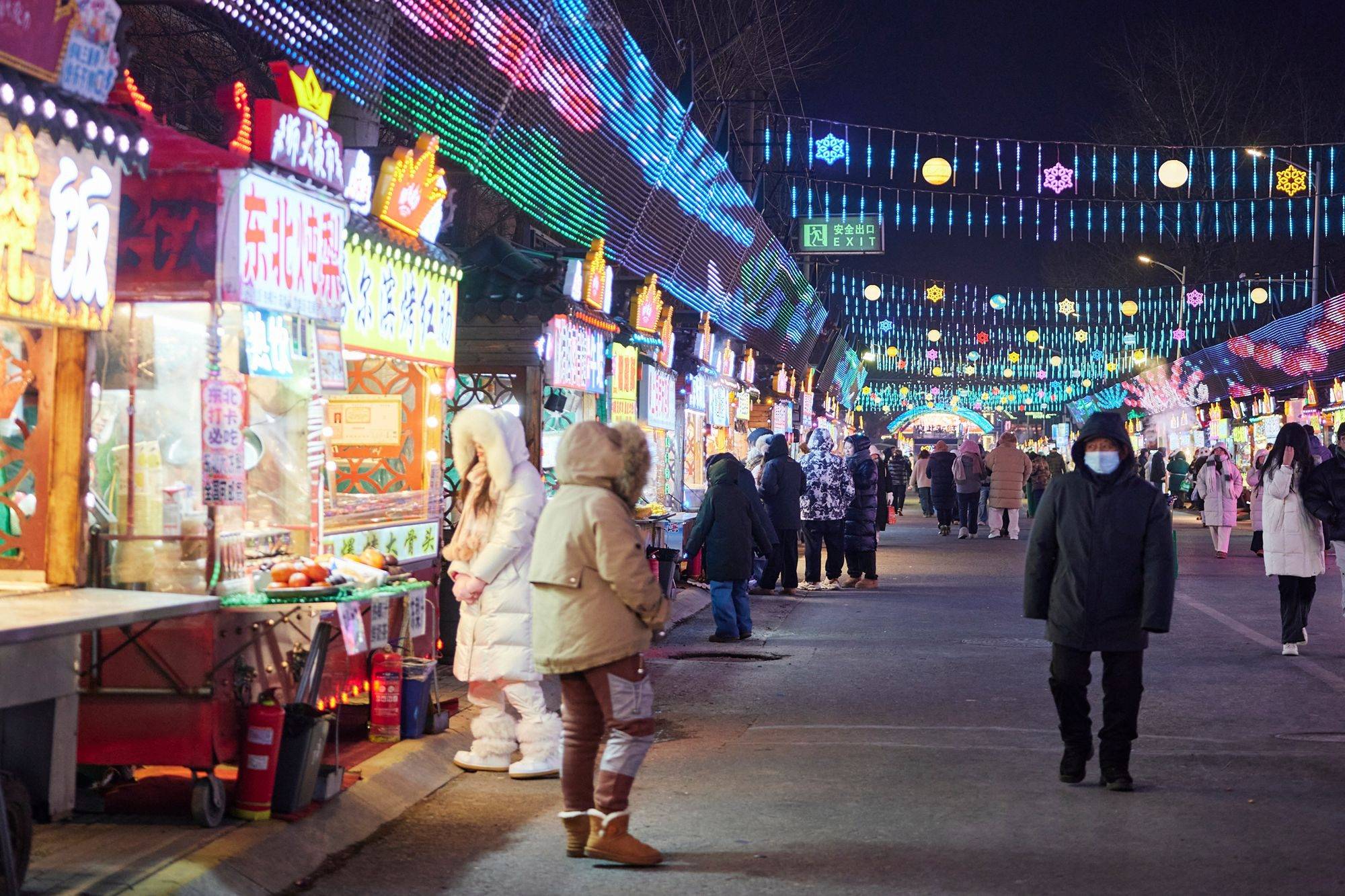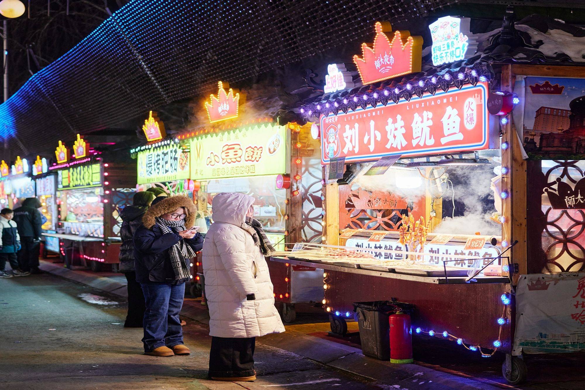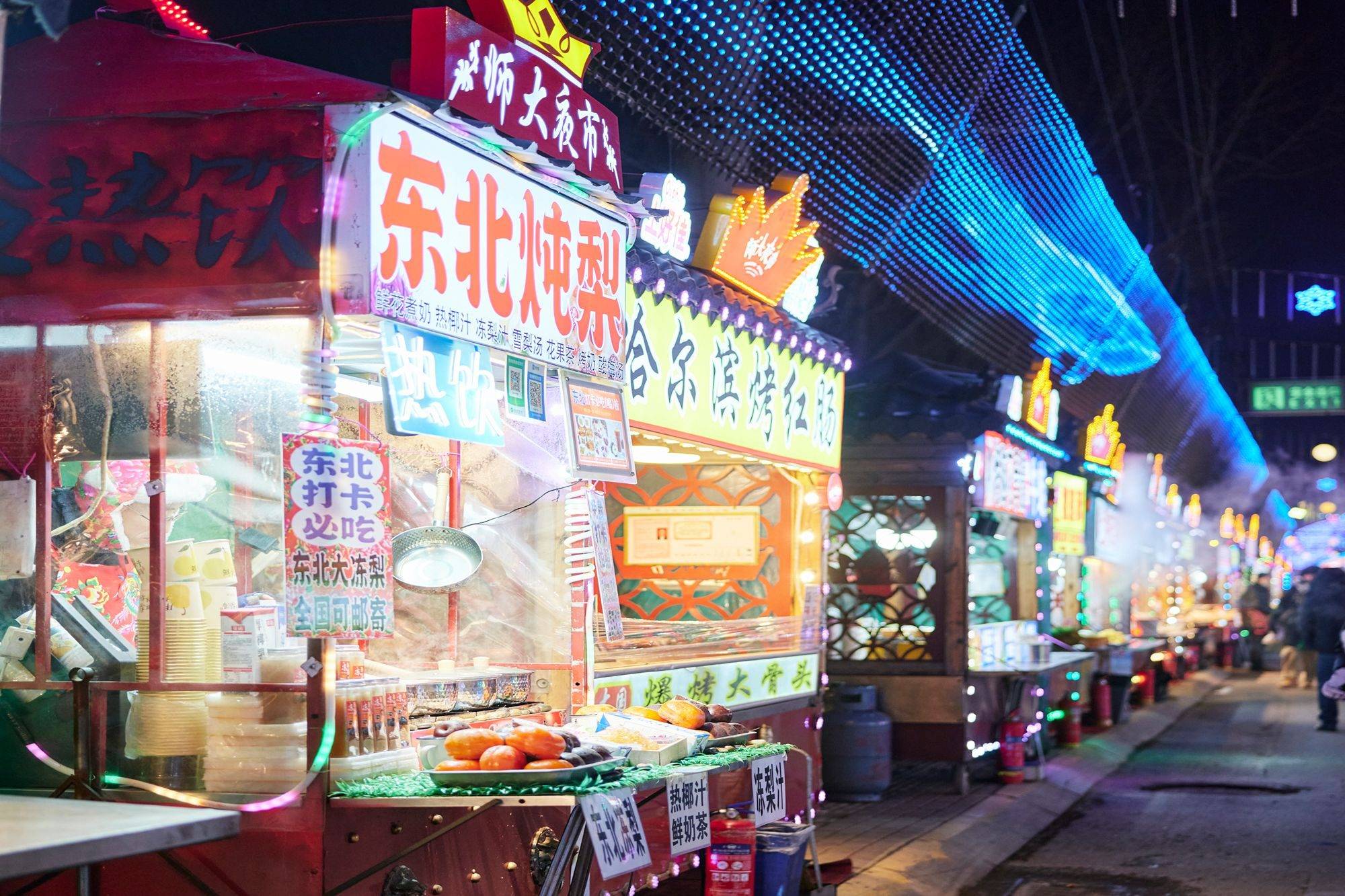 来夜市逛最重要的功课当然是“吃”。师大夜市像个露天美食博物馆,可以看到最本土化的东北特色小吃,冰冻所有——冻梨、冻桃、冻草莓,万物皆可“冰糖”——冰糖柿子、冰糖糖辣椒、冰糖豆包,还有烙饼卷一切——卷鸡蛋、卷米饭、卷韭菜……