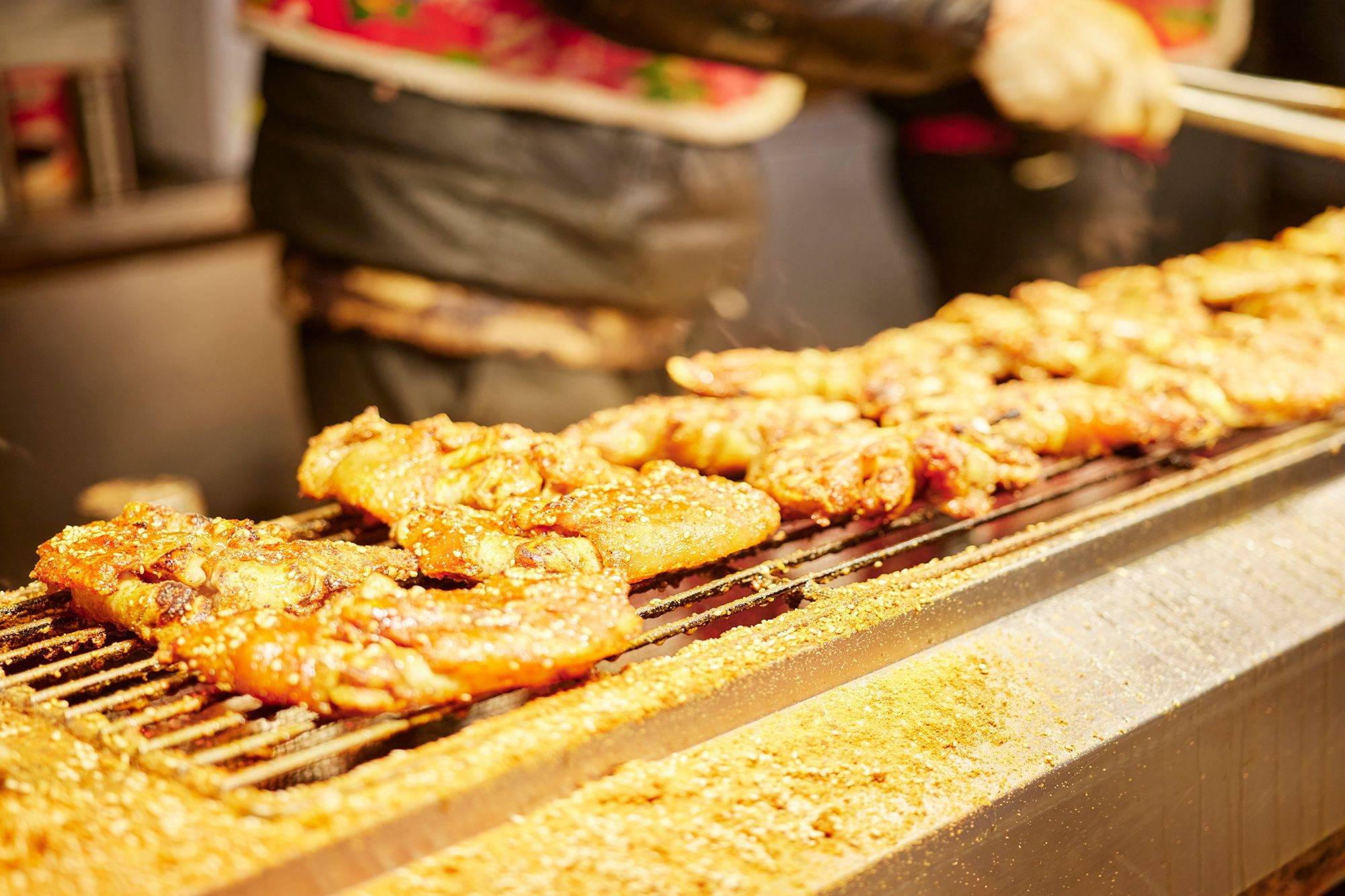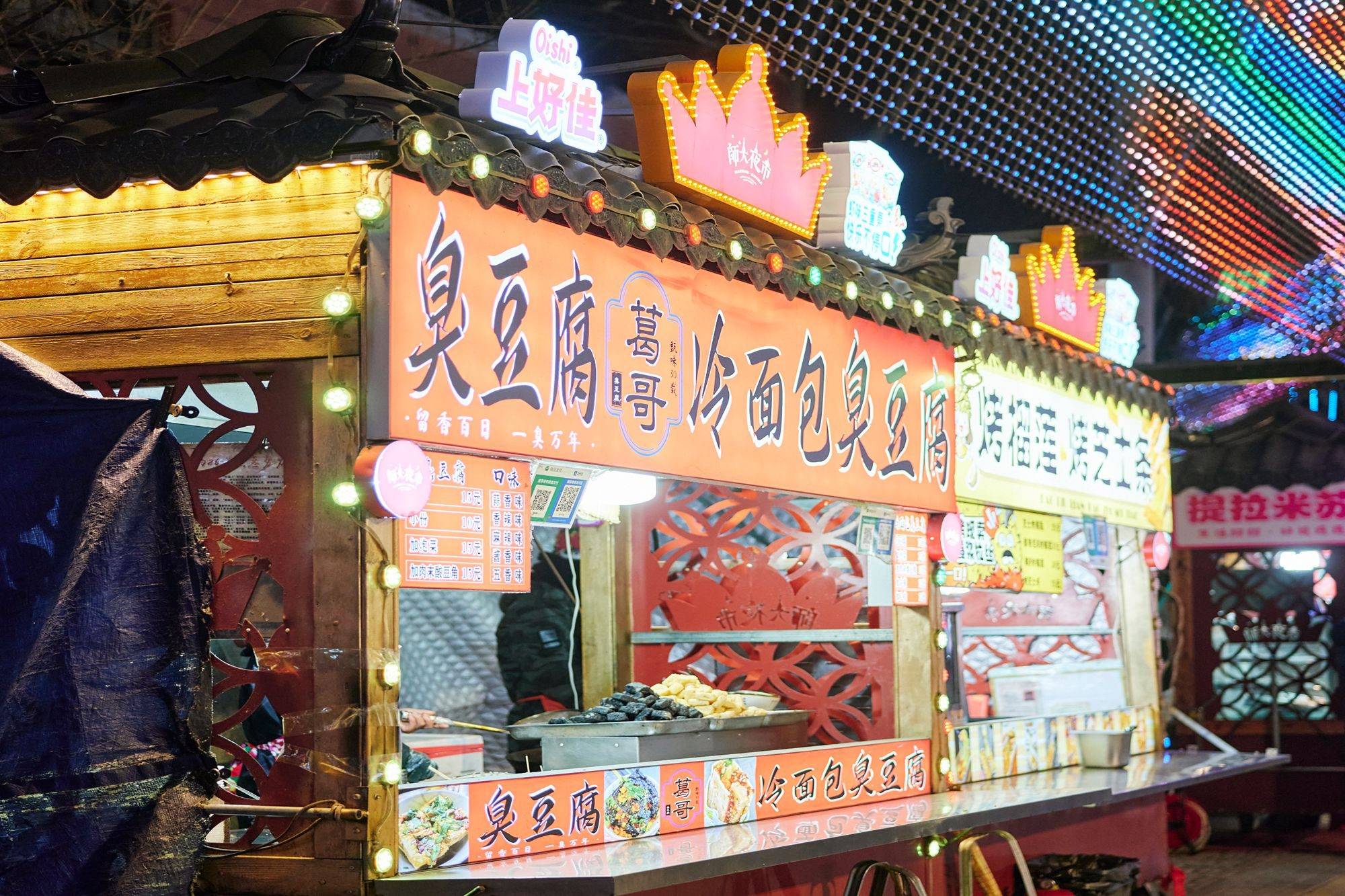 街道两侧店面一个挨着一个,用最醒目的标牌写上最当家的美食。摊位紧紧连在一起,将空间利用到最大化,毕竟来这里打卡的人总是络绎不绝,再多店家也不用担心无法消化。