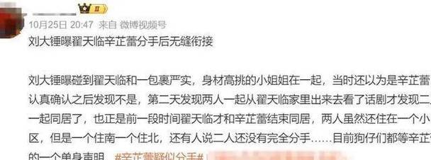 娱乐记者刘大锤在平台上爆料:辛芷蕾与翟天临疑似分手,已经结束同居的生活。