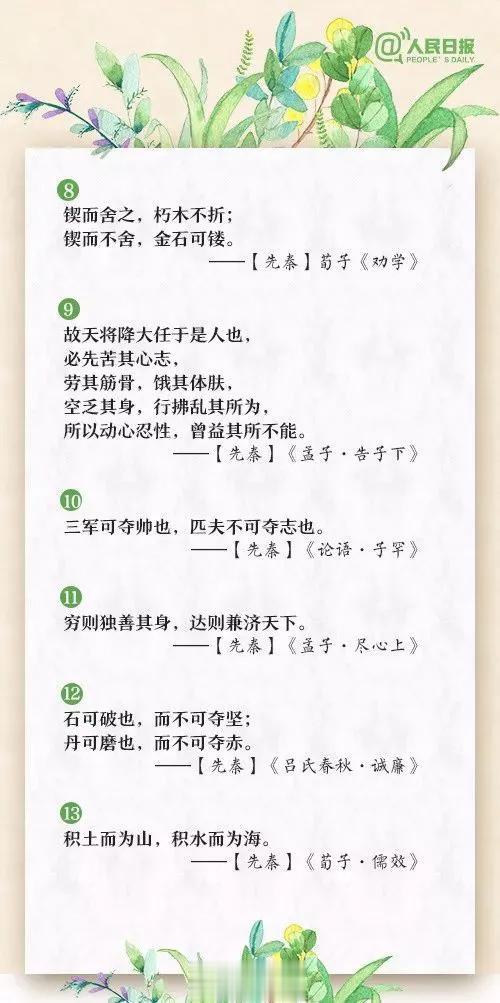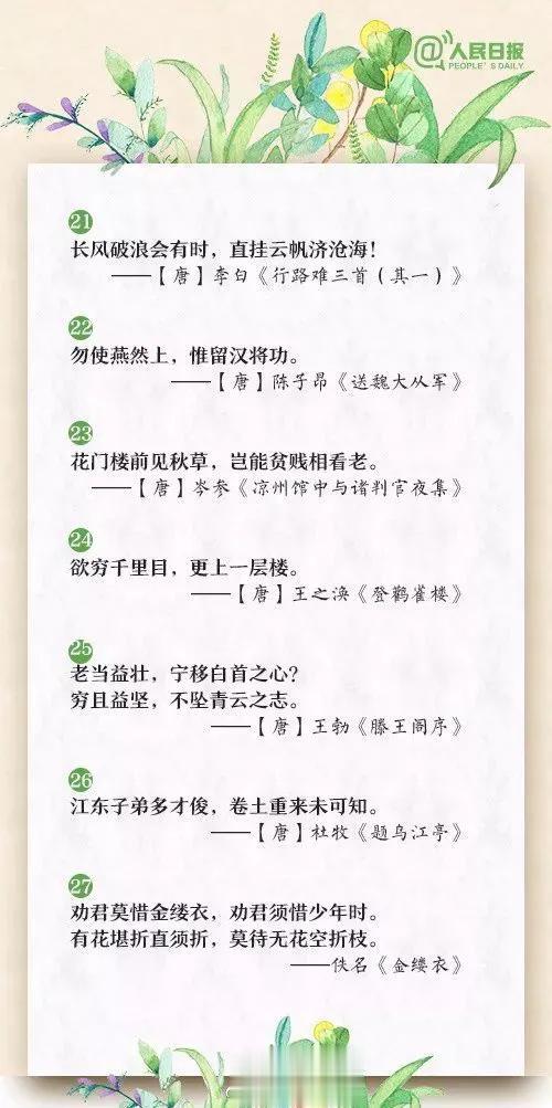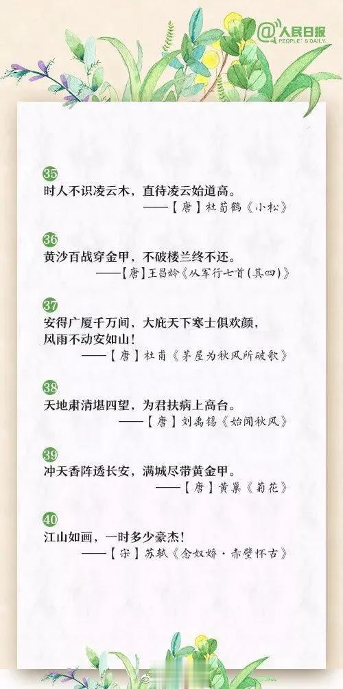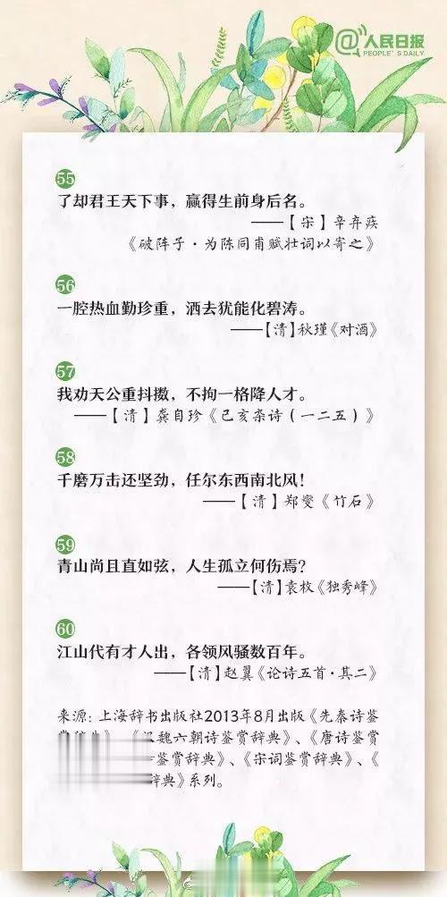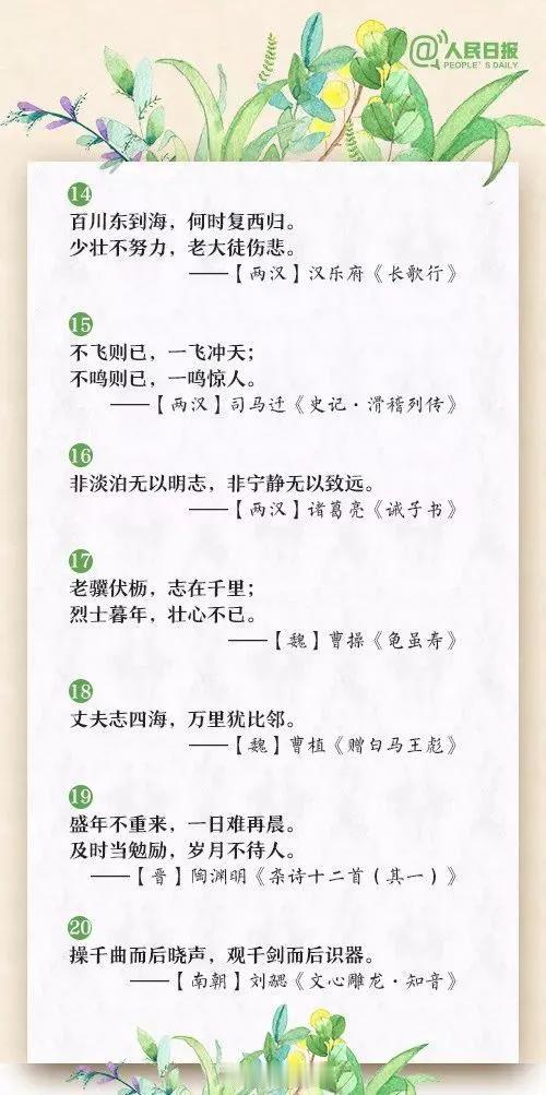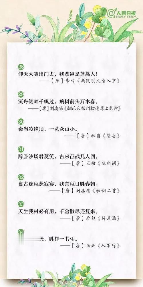 【人民日报推荐:60句激发孩子上进心的古诗文:孩子,古人劝你好好读书!】 孩子学习没有动力?偶尔迷失丢掉方向?古人也一样,但在生活或事业的坎坷中,他们用诗词吟唱出心中的力量。 从“长风破浪会有时,直挂云帆济沧海”的乐观豁达,到“千磨万击还坚劲,任尔东西南北风”的执着坚定,60 句励志古诗文,总有一句能点燃孩子的斗志!转发收藏!