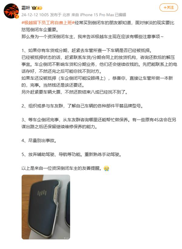 今日,知名大V博主“霜叶”发布微博,从一个“资深倒闭车主”的角度出发,向极越车主发出善意提醒,据悉,其本人多年前曾购买一台威马,而威马早已成为了历史。