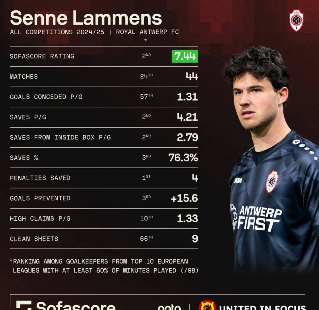 比利时皇家安特卫普的年轻门将塞纳·拉门斯(Senne Lammens)已同意今夏加盟英超豪门曼联,能否最终成行则取决于两家俱乐部在转会费上的谈判结果。这位仅23岁的门将被认为是一颗新星,他和阿斯顿维拉的埃米利亚诺·马丁内斯被鲁本·阿莫林选入新一届的门将候选名单。然而,考虑到马丁内斯的转会难度较大,拉门斯似乎成为了更现实的选择。