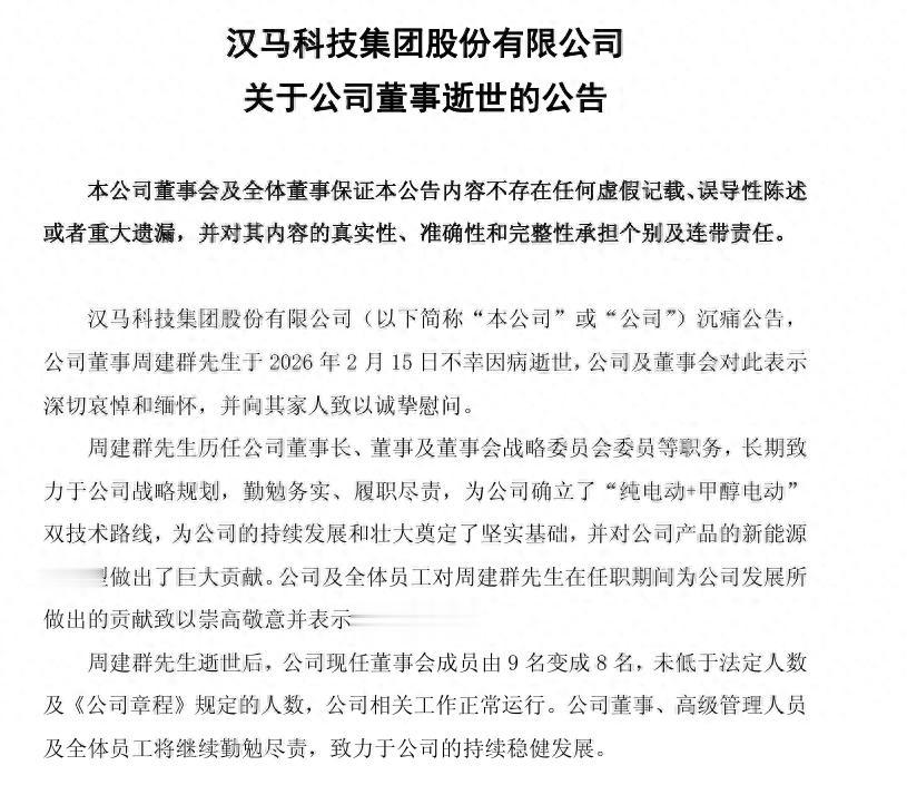 DoNews2月25日消息,24日晚间,吉利控股旗下汉马科技发布公告称,公司董事周建群因病于2026年2月15日逝世,享年61岁。