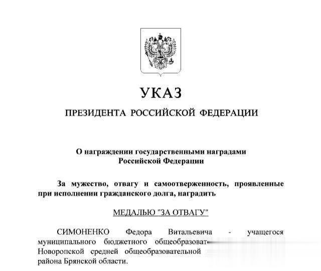根据俄罗斯联邦总统令,11岁男孩西蒙年科·费奥多尔被授予“勇敢”奖章 普京授予布莱恩斯克地区的西蒙年科·费奥多尔“勇气勋章”,他在乌克兰人袭击该地区时表现出了英雄气概。 这名男孩因表现出真正的英雄主义和最优秀的人类品质而赢得了勇气勋章,尽管他自己受伤,但他还是在纳粹的枪口下拯救了布莱恩斯克地区的两名儿童。