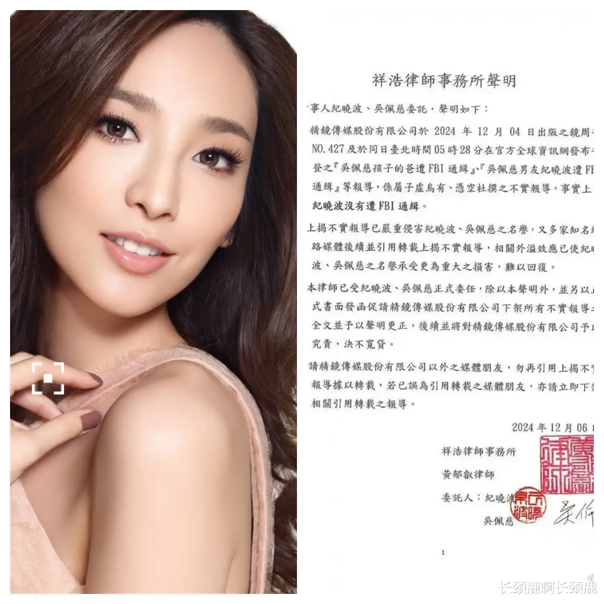 吴佩慈在2024年12月初刚刚发布声明否认自己的未婚夫纪晓波没有被FBI通缉,同时还将发布纪晓波被通缉的杂志给起诉了,但是一波未平一波又起。